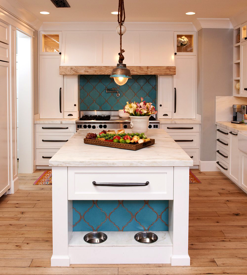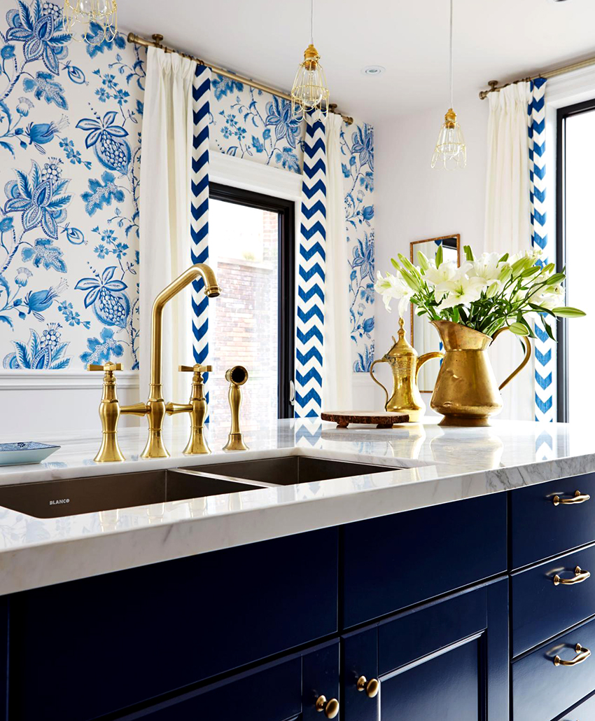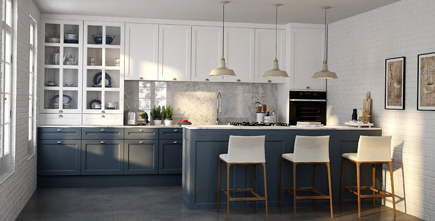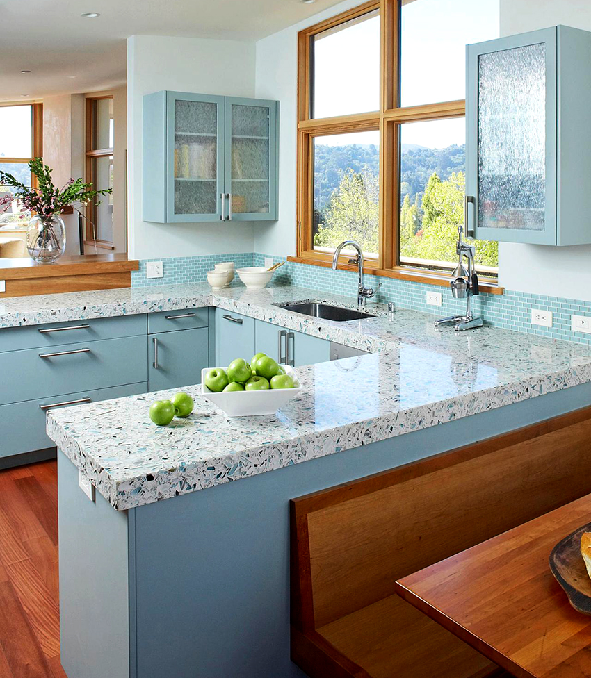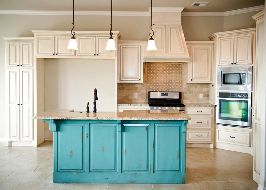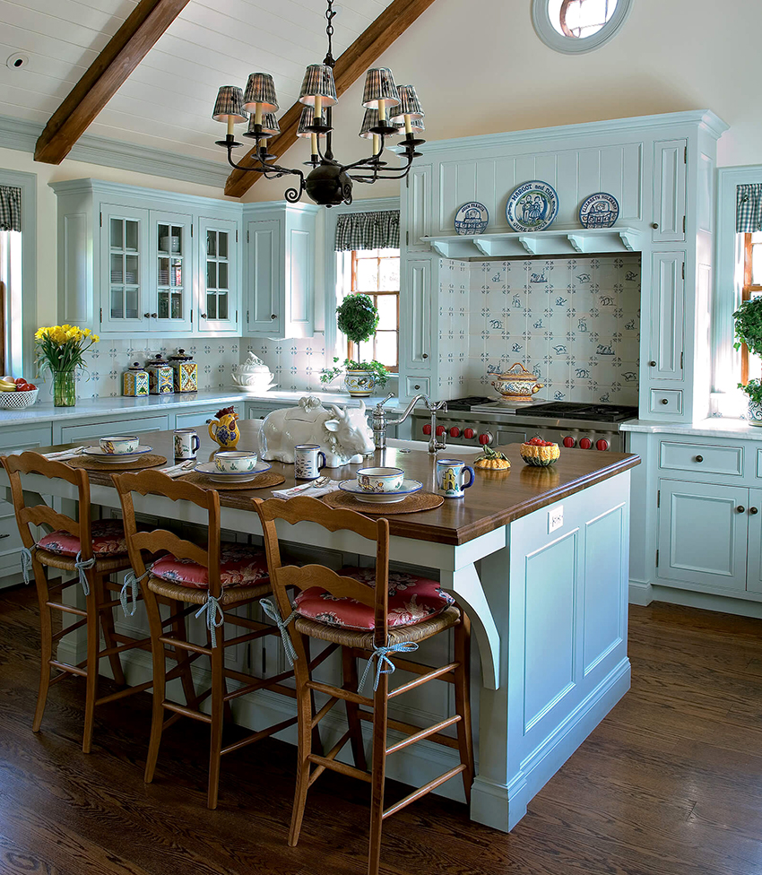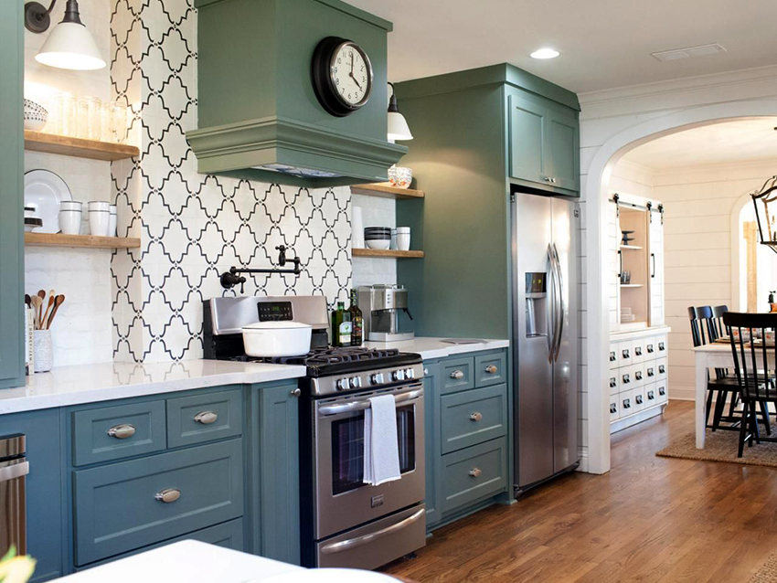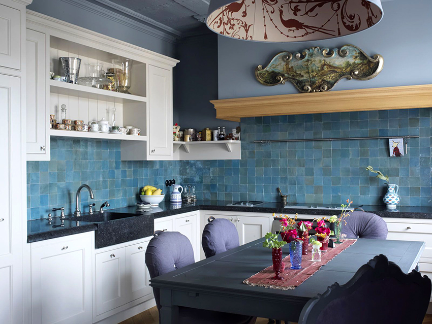 - País. Neste caso, recomenda-se o uso de cores azuis mais brilhantes, utilizadas para o acabamento do avental, assim como de outras superfícies. É bom combinar tons de branco e verde e até preto e branco em tal interior.