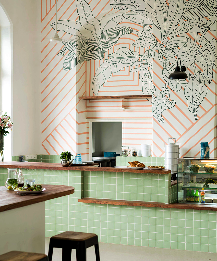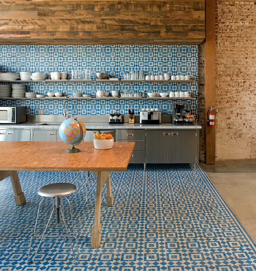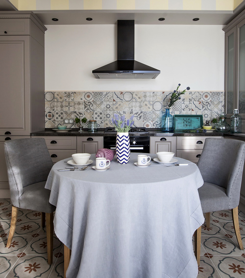 - Formas geometricamente regulares nas paredes da cozinha, como quadrados, listras que se cruzam, criam o efeito de um espaço contínuo.
