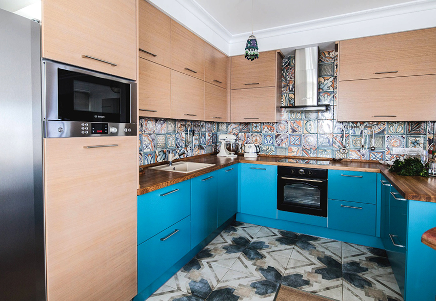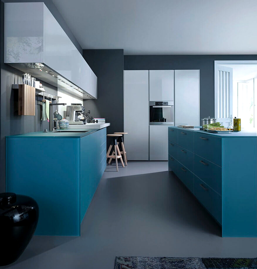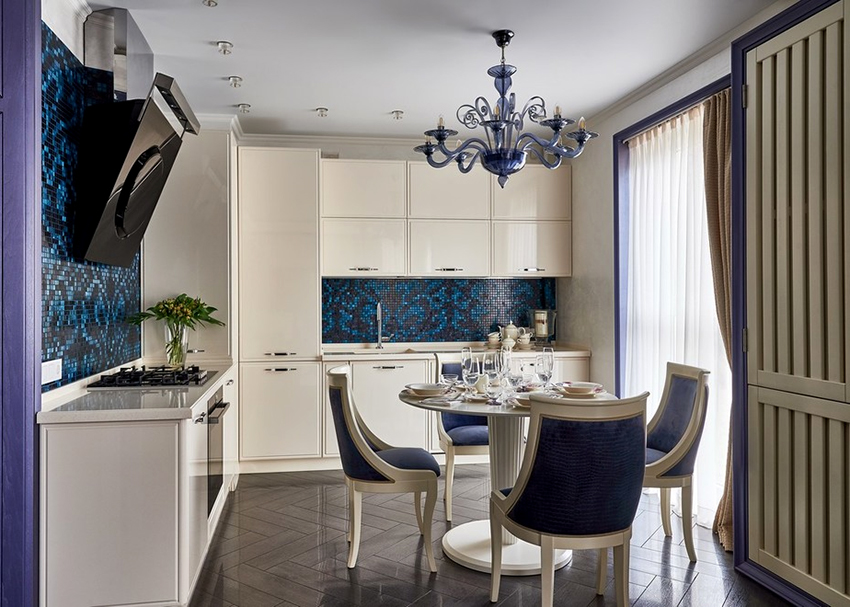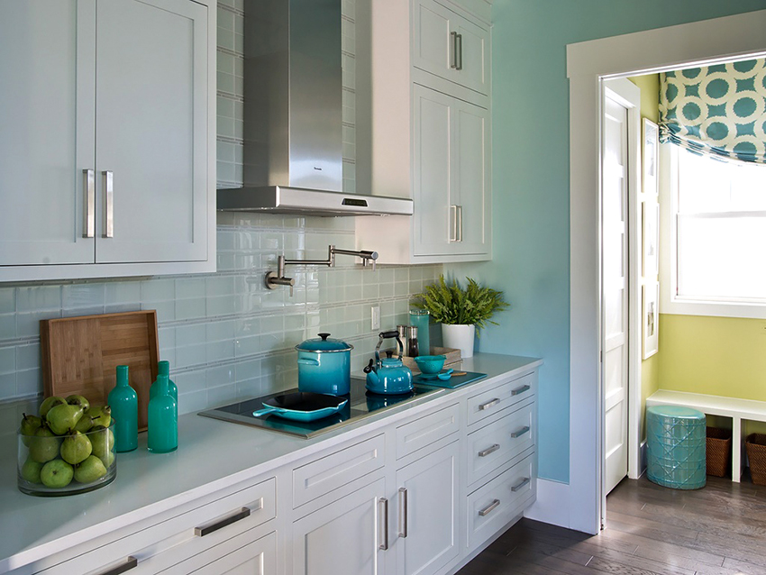 Os tons frios claros aumentam visualmente a altura das paredes. Portanto, se o cômodo não for alto, é aconselhável fazer a cozinha na cor azul, enquanto é recomendado deixar as paredes lisas.