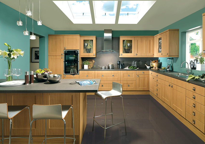 Em uma cozinha espaçosa, também não é recomendado o uso de muito branco, que amplia visualmente o ambiente, pois você pode obter o efeito de um grande espaço desabitado. Neste caso, paredes azuis claras serão adequadas, contra o fundo com fachadas em marrom claro ou com textura de madeira.