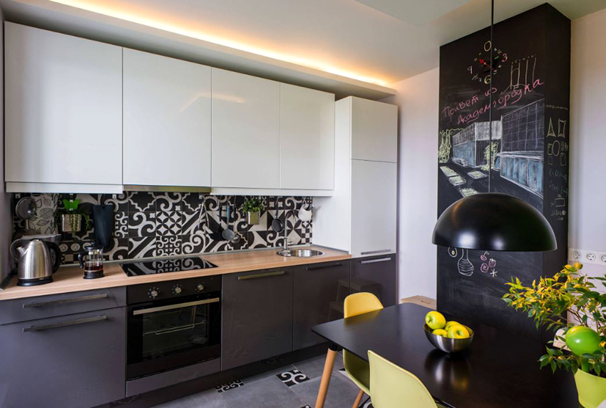 Importante! As paredes de uma cozinha estreita e alongada não podem ser pintadas em duas cores, já que com esta opção de desenho a divisão vai adquirir uma forma ainda mais irregular e alongada.