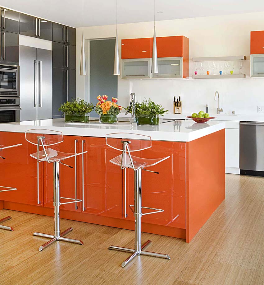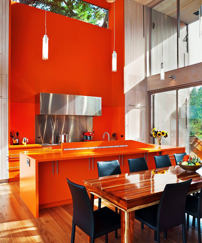 O laranja é considerado uma cor suculenta que ajuda a despertar o apetite. É especialmente importante fazer essa cozinha para famílias com crianças pequenas. No interior, convém usar todos os tons de laranja que lembrem o caloroso verão: laranja, âmbar, pêssego. Laranja é uma opção versátil porque se encaixa bem no interior de cozinhas pequenas e grandes.