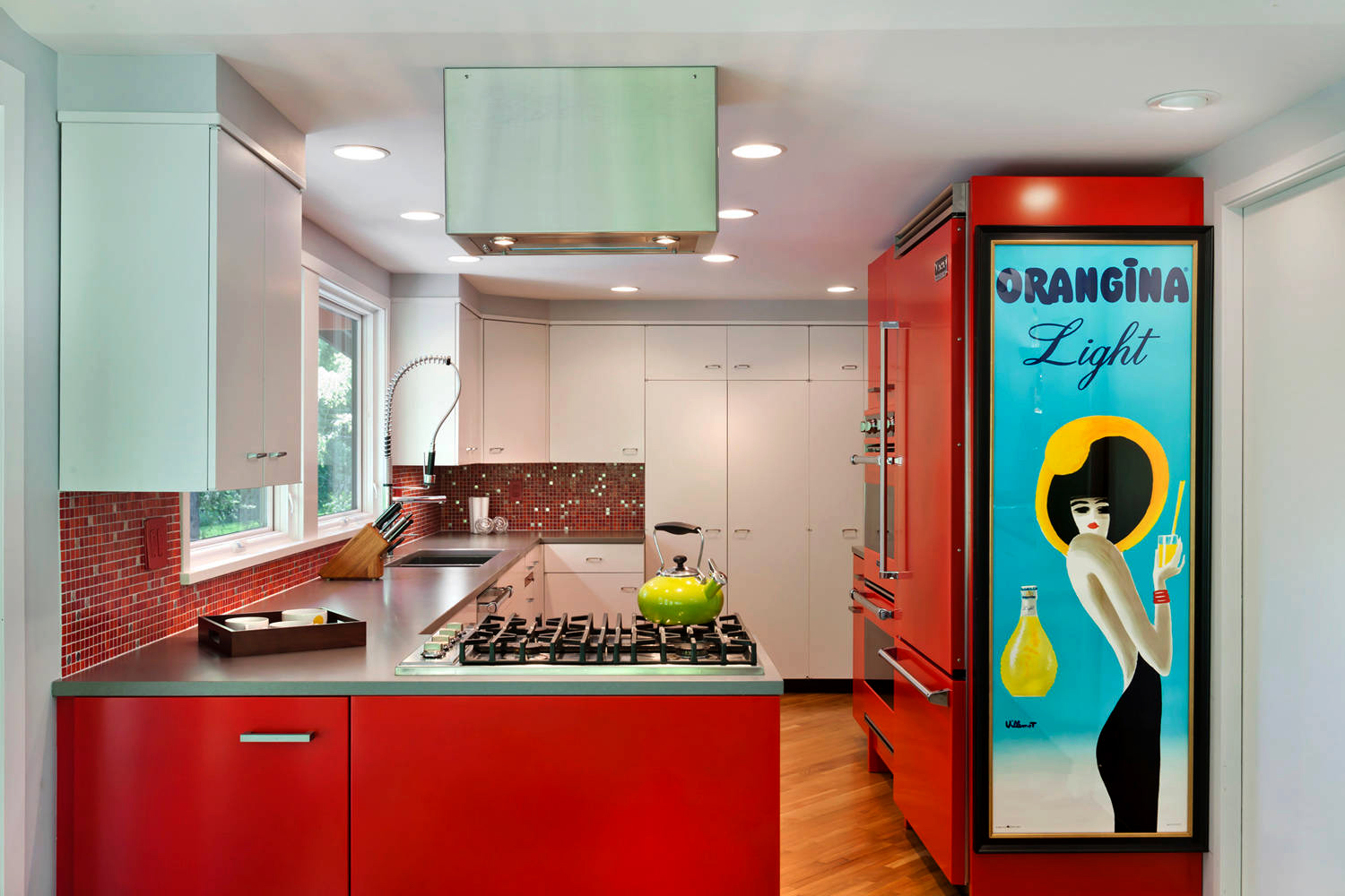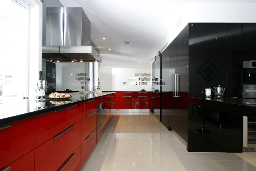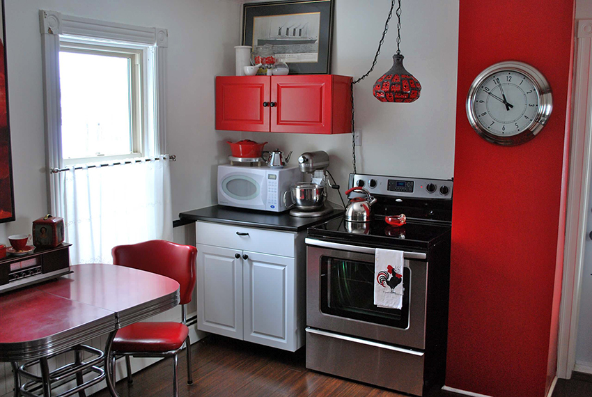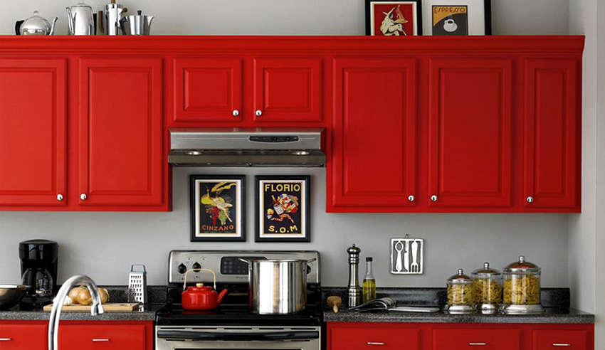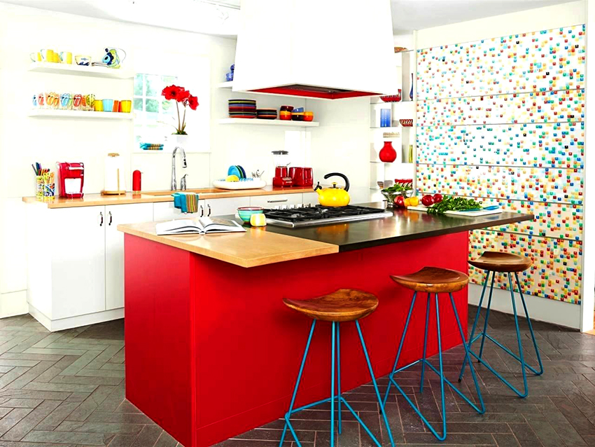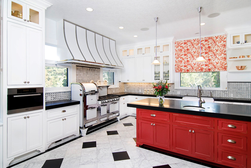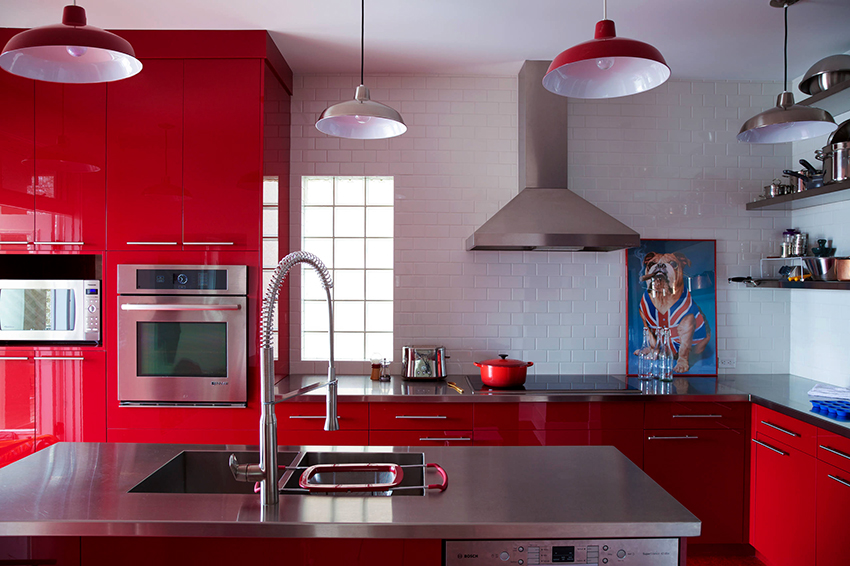 Os tons de vermelho são recomendados para decorar cozinhas nos estilos retro, provençal e fusion. Se usado corretamente, o vermelho também é adequado para criar um interior clássico. A versatilidade desta cor reside no facto de poder ser facilmente combinada com outras tonalidades e uma variedade de padrões geométricos.