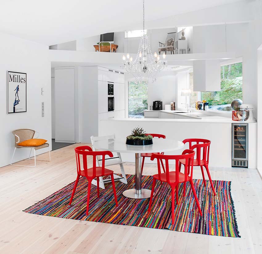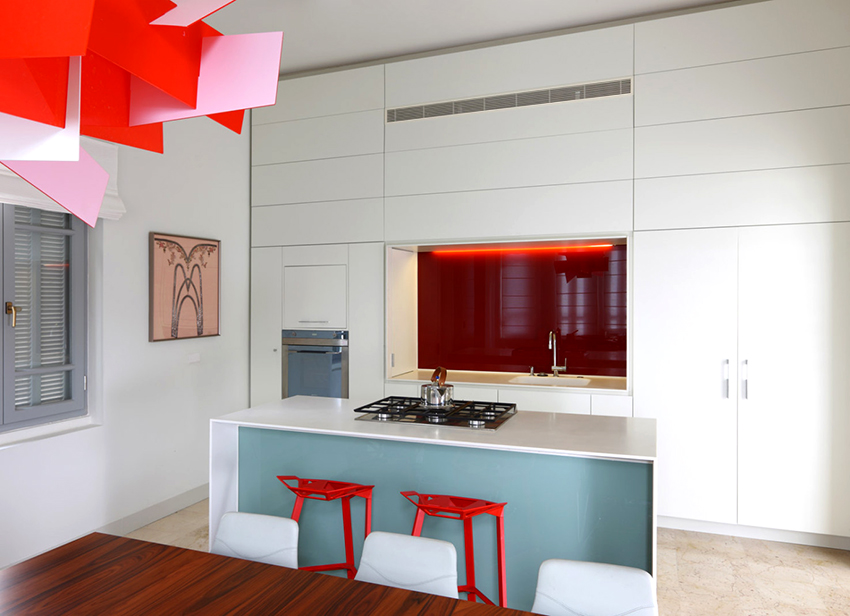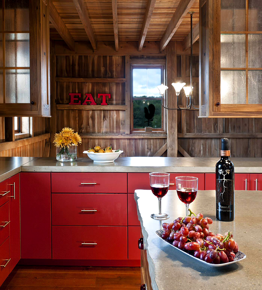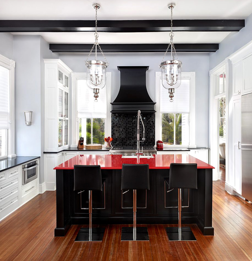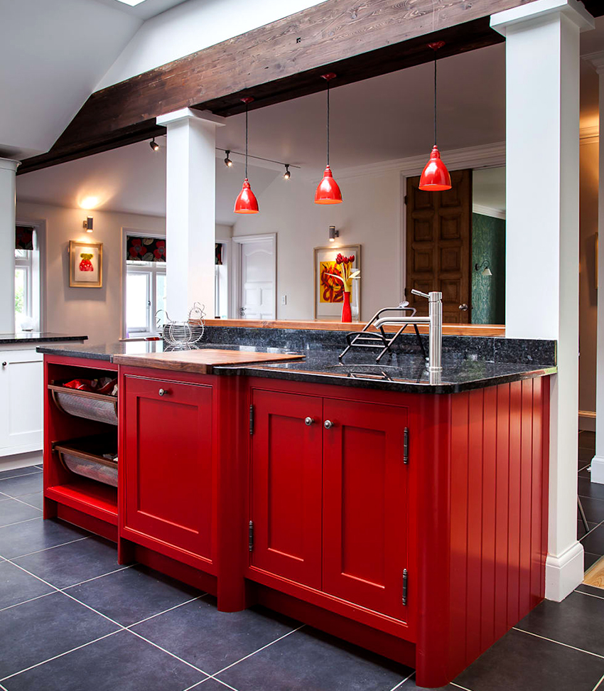 Os tons de vermelho são recomendados para decorar cozinhas nos estilos retro, provençal e fusion. Se usado corretamente, o vermelho também é adequado para criar um interior clássico. A versatilidade desta cor reside no facto de poder ser facilmente combinada com outras tonalidades e uma variedade de padrões geométricos.