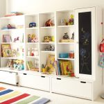 - Para uma criança dos 6 aos 10 anos. Como a partir dessa idade as crianças começam a se interessar pela criatividade e pelos jogos de tabuleiro, é necessário organizar nas prateleiras um local para guardar cadernos, livros didáticos e papelaria. Neste caso, uma estante de livros no quarto das crianças será uma excelente opção.