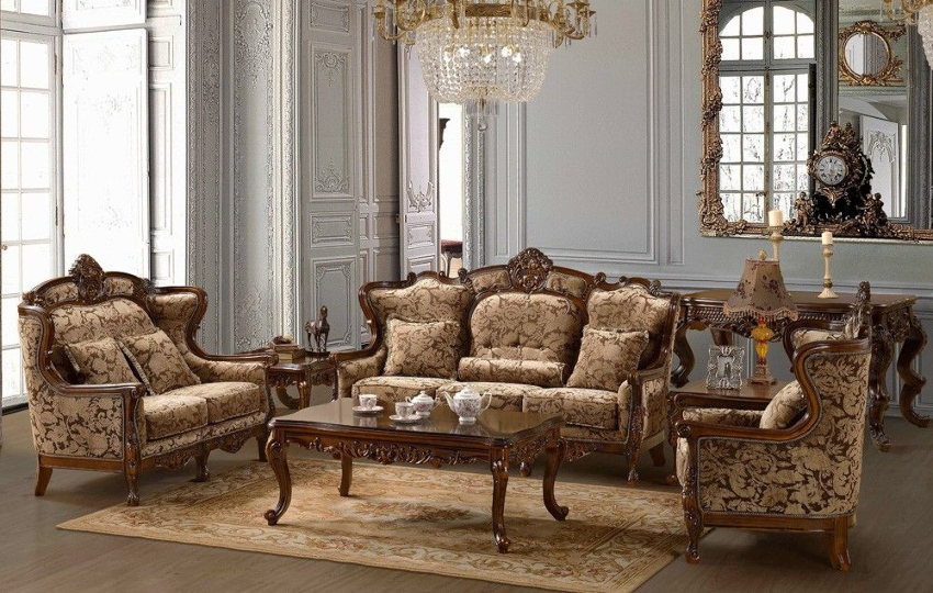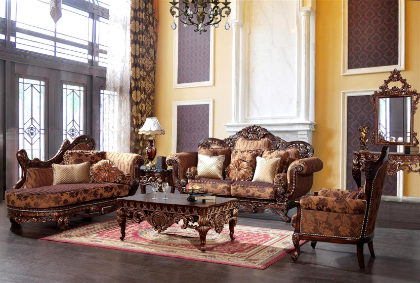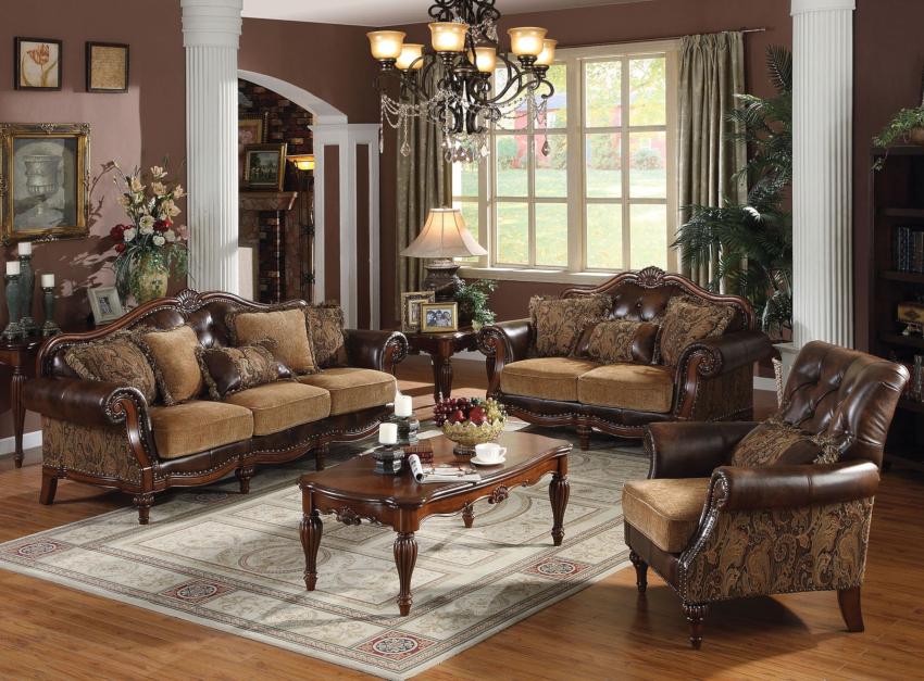 La proiectarea unui living clasic, se acordă o atenție specială alegerii obiectelor de mobilier. Aici se folosesc exemplare masive, solide, scumpe din material natural. Lemnul natural ocupă locul de frunte. Mobilierul din maro închis sau mahon va arăta deosebit de nobil și sublim, ceea ce se reflectă în fotografiile designului interior al camerei de zi. Produsele sunt decorate cu elemente decorative sub formă de inserții din bronz sau ornamente sculptate.