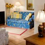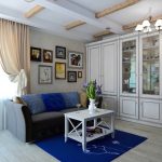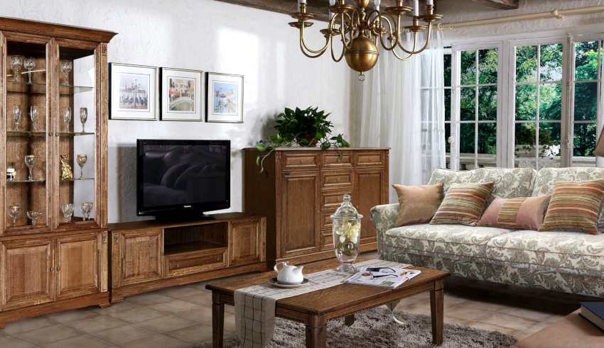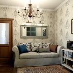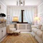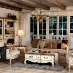 Canapelele și fotoliile sunt selectate în așa fel încât produsele să nu atragă atenția. Mobilierul cu laturi din lemn masiv este binevenit. Tapițeria moale trebuie să fie simplă, să se potrivească cu culoarea decorului de perete sau să conțină un mic model floral. Într-o cameră spațioasă, ar trebui să instalați un mezanin pictat, o comodă și o măsuță de cafea. Mobilierul modular multifuncțional elegant se va potrivi în mod ideal într-o cameră mică.