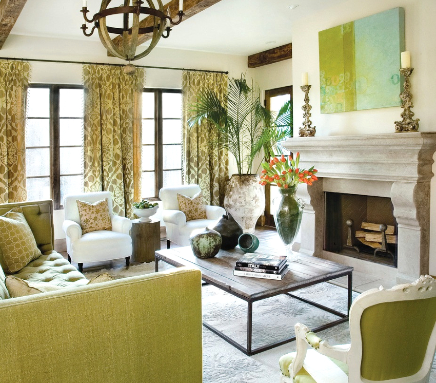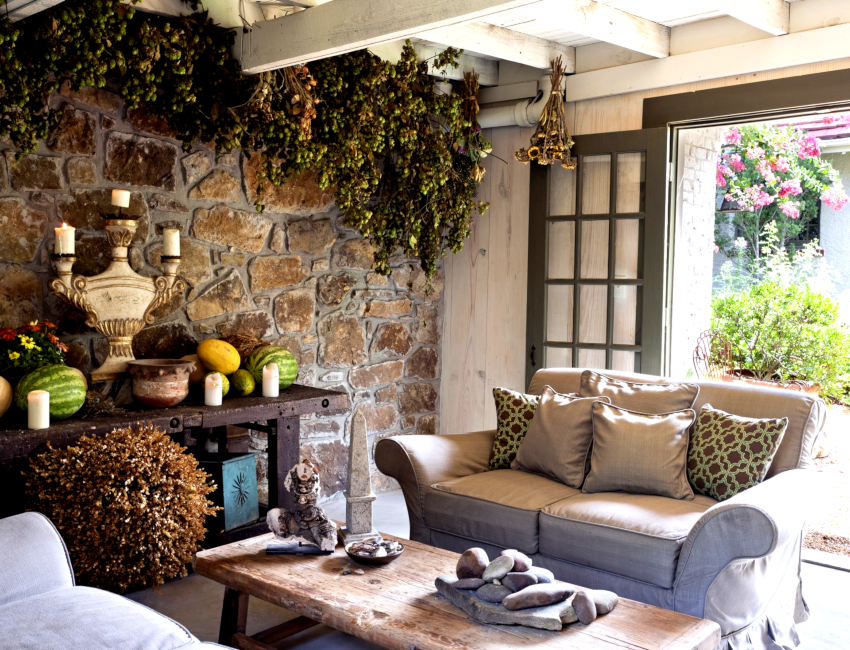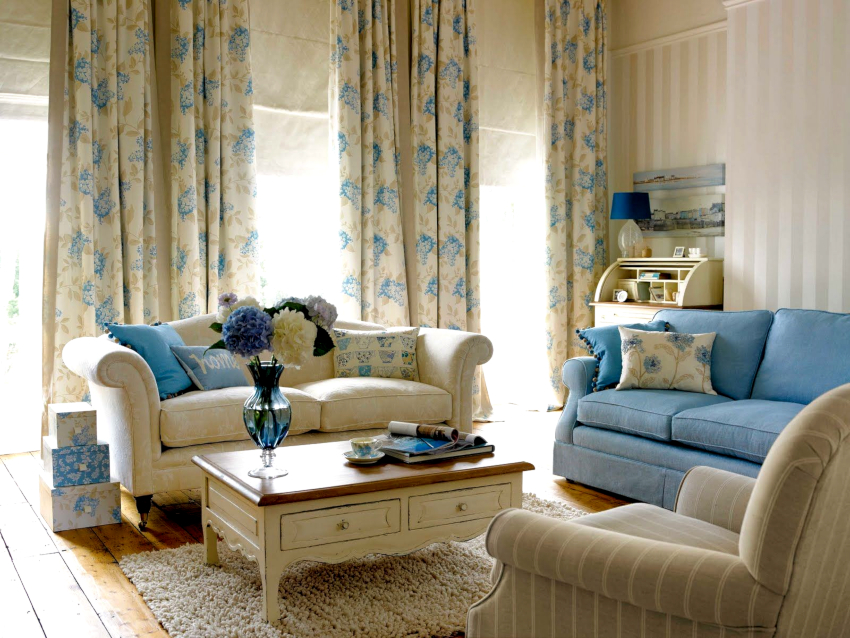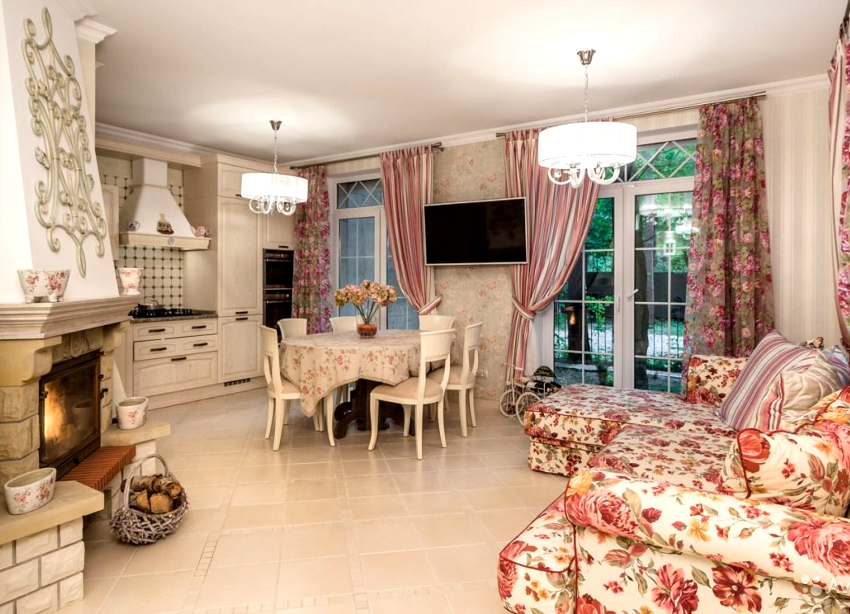 Un plus caracteristic la designul unei camere de zi în stil Provence va fi aranjamentele florale în formă vie sau uscată
