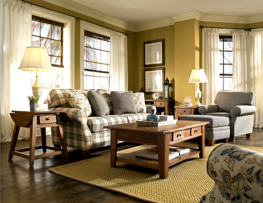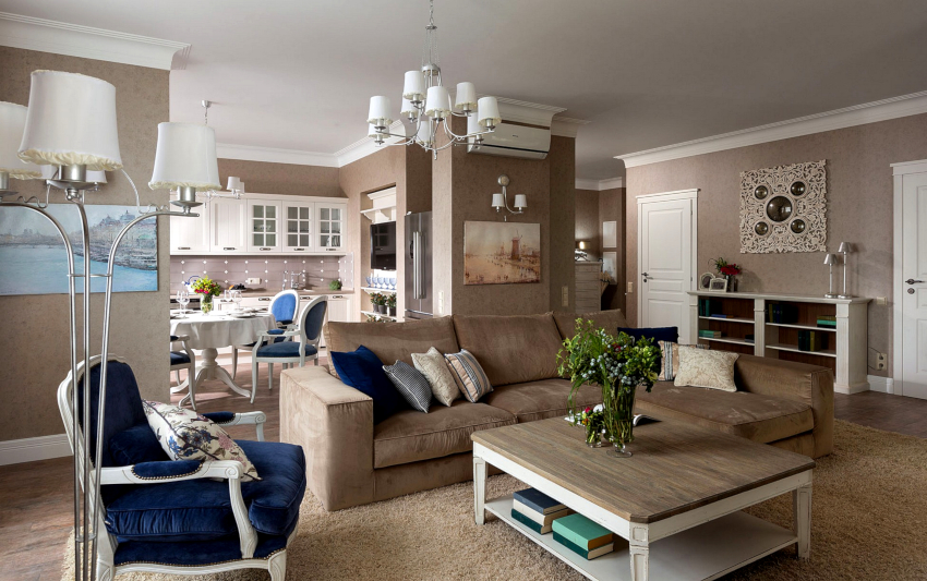 Un living conservator va ieși cu utilizarea dominantă a maro, care evocă asocieri cu siguranță, fiabilitate și stabilitate. Clasicele pot fi întruchipate cu o nuanță albastră, care ar trebui folosită într-o cantitate măsurată ca culoare de fundal pentru pereți și tavane. Mobilierul din lemn de culoare închisă și materialele textile luminoase vor ajuta la confortul atmosferei reci.