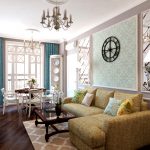 Combinația de produse cu aceeași textură, dar imprimarea diferită, arată originală. Cu toate acestea, ambele opțiuni ar trebui să aibă o caracteristică comună, care se poate reflecta în mat vintage, acoperire din velur sau luciu metalic. Astfel de combinații sunt prezentate în fotografia designului sufrageriei-studiourilor.