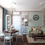 Toate nuanțele de verde, gri, bej, menta, albastru, fistic și liliac sunt de bază, relevante pentru modernitate. Galben, violet sau roșu poate fi folosit ca ton de accent, care este prezentat în fotografia designului camerei de zi de 18 mp. m.