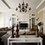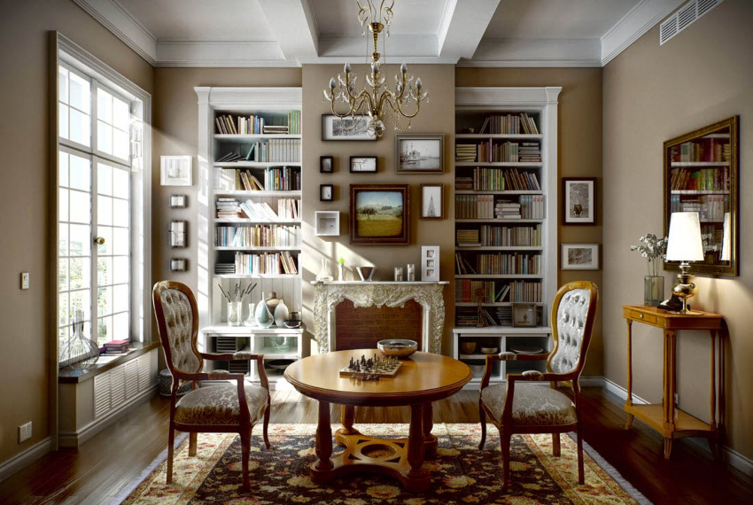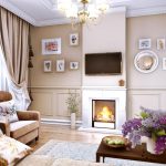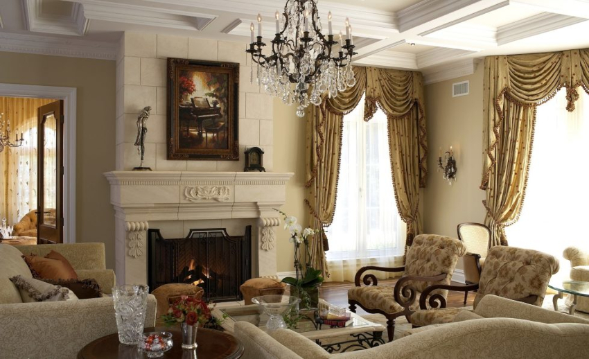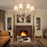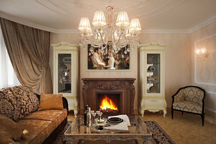 Într-o cameră de zi clasică, o canapea de lux cu cotiere sculptate, completată de o pereche de fotolii, o măsuță de cafea elaborată cu picioare curbate și o bibliotecă cu inserții aurite vor arăta potrivite. Un element obligatoriu al unui living clasic este un șemineu cu ramă de piatră. Trebuie completat cu sfeșnice de argint pe un raft deschis deasupra acestuia. Diferite opțiuni de design pot fi văzute în fotografia opțiunilor de design interior pentru o cameră de zi cu șemineu.