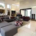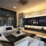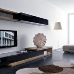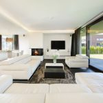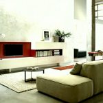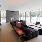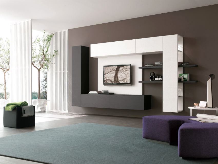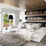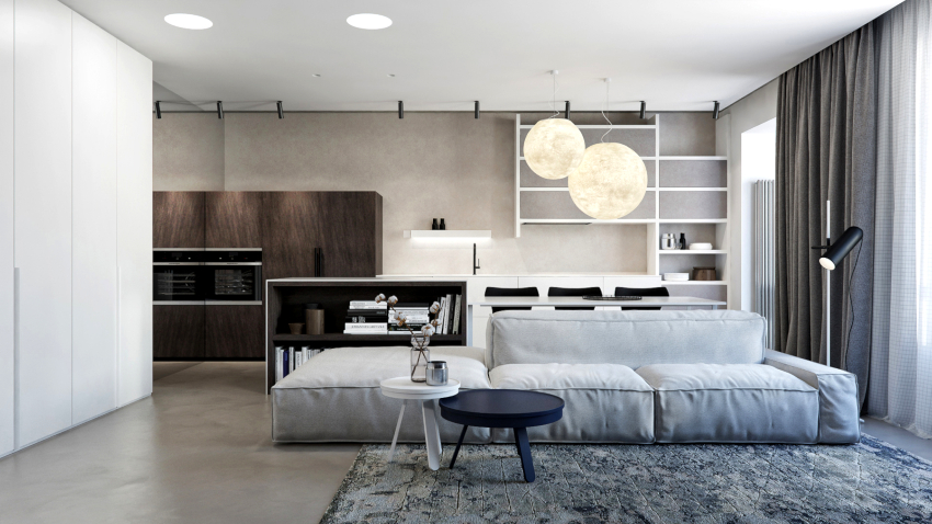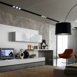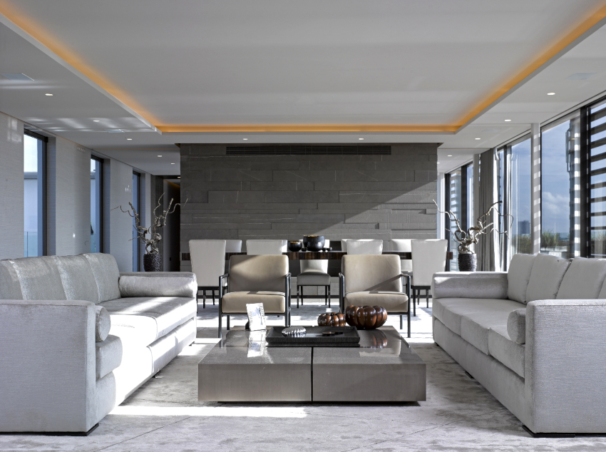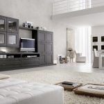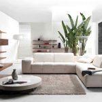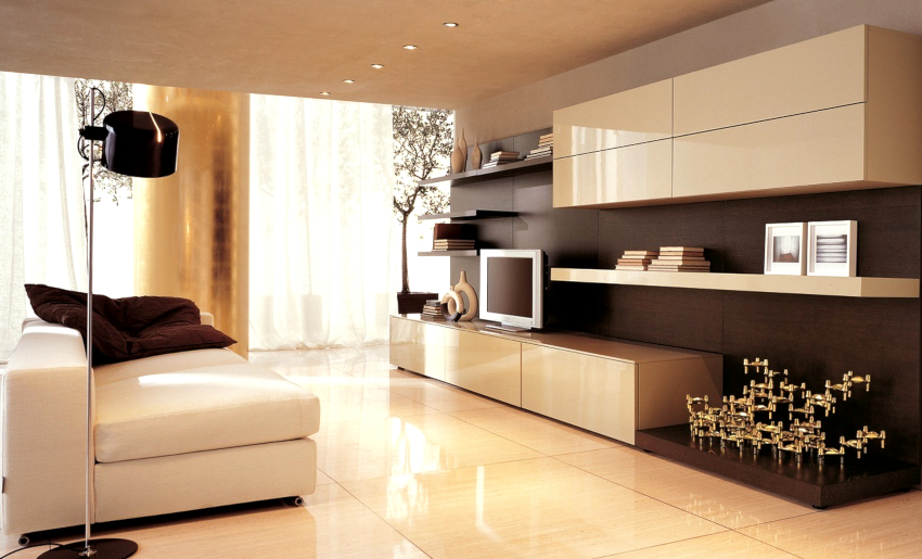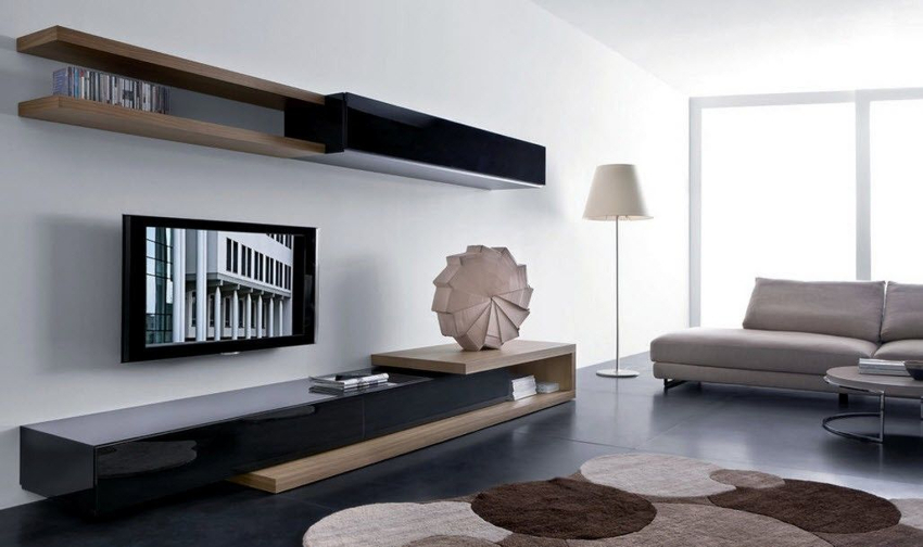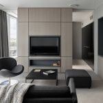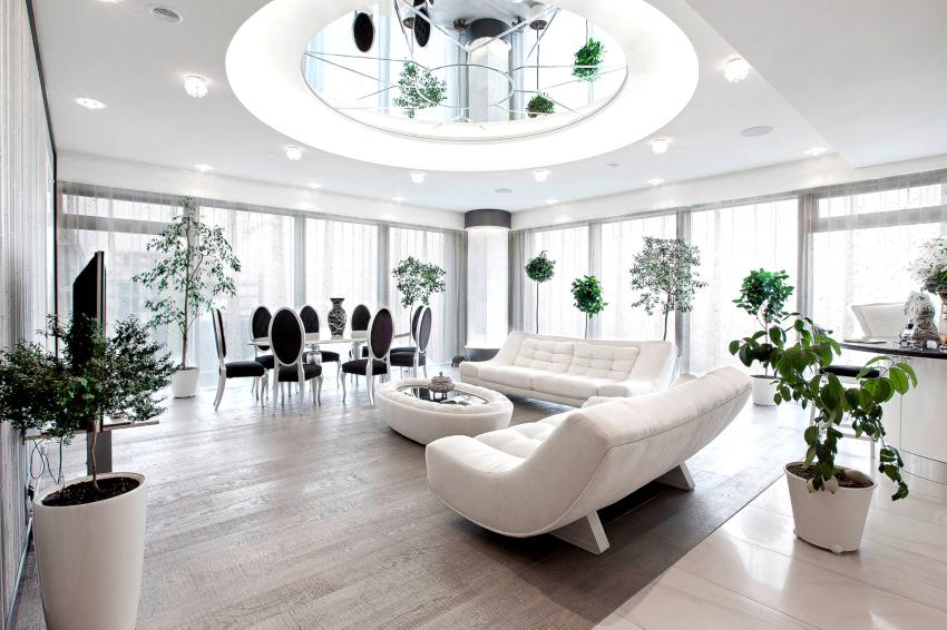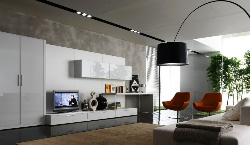 Tapițeria trebuie să fie solidă. Masa de cafea rotunjită poate fi din sticlă sau piatră. Pentru a organiza un sistem de depozitare, este suficient să folosiți mai multe rafturi închise ascunse în spatele unei fațade monocromatice lucioase.