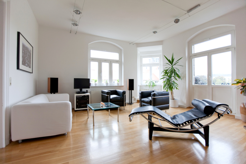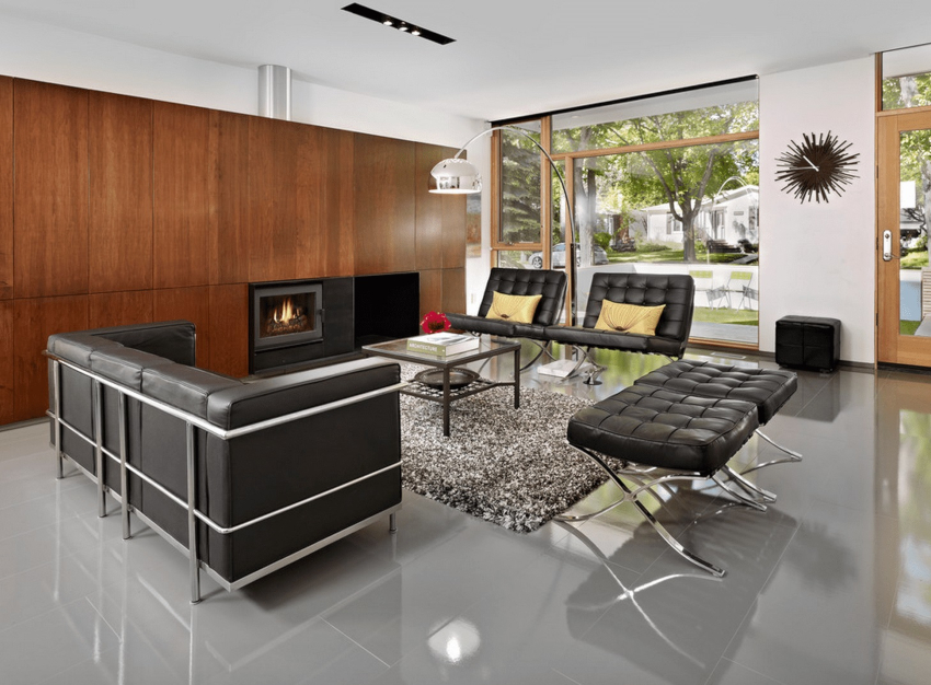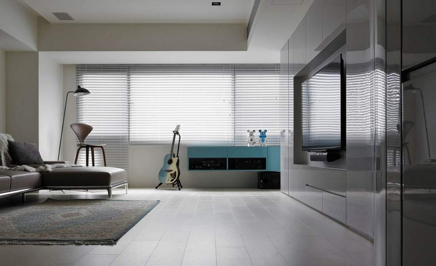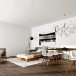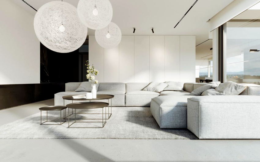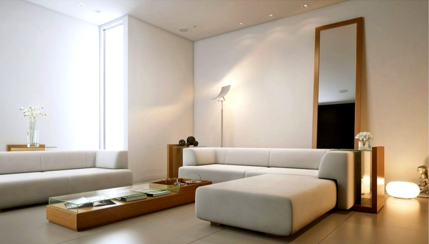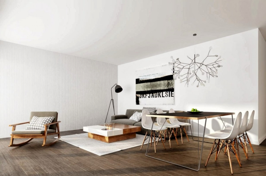 Decorarea pereților, tavanului și podelei în designul camerei de zi în stilul minimalismului