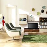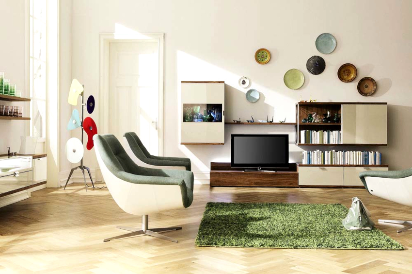 Tendința ecologică pentru o cameră de zi minimalistă este utilizarea verde ca principală nuanță naturală. Tonurile de măsline și menta sunt potrivite ca fundal. Puteți crea un accent cu o culoare bogată pe bază de plante.
