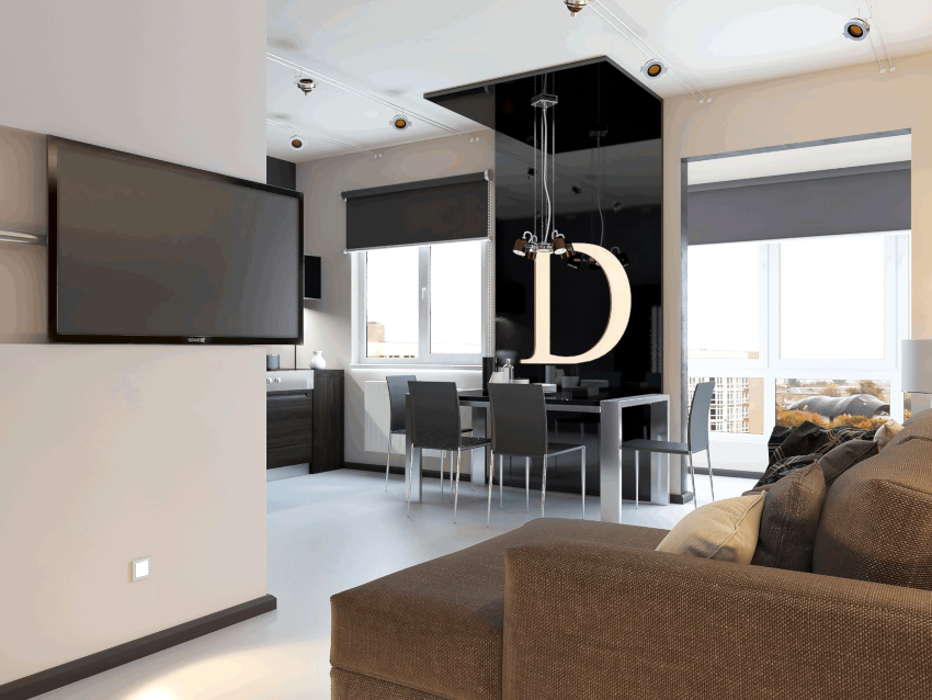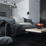 Designul interior al camerei de zi în stil high-tech este realizat folosind culori albe, negre și gri