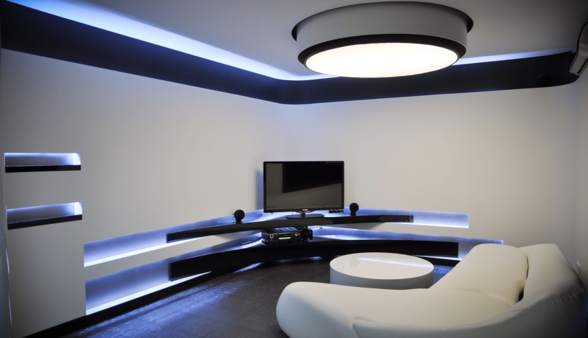 Amenajarea interioară a unei camere de zi într-un stil modern de înaltă tehnologie
