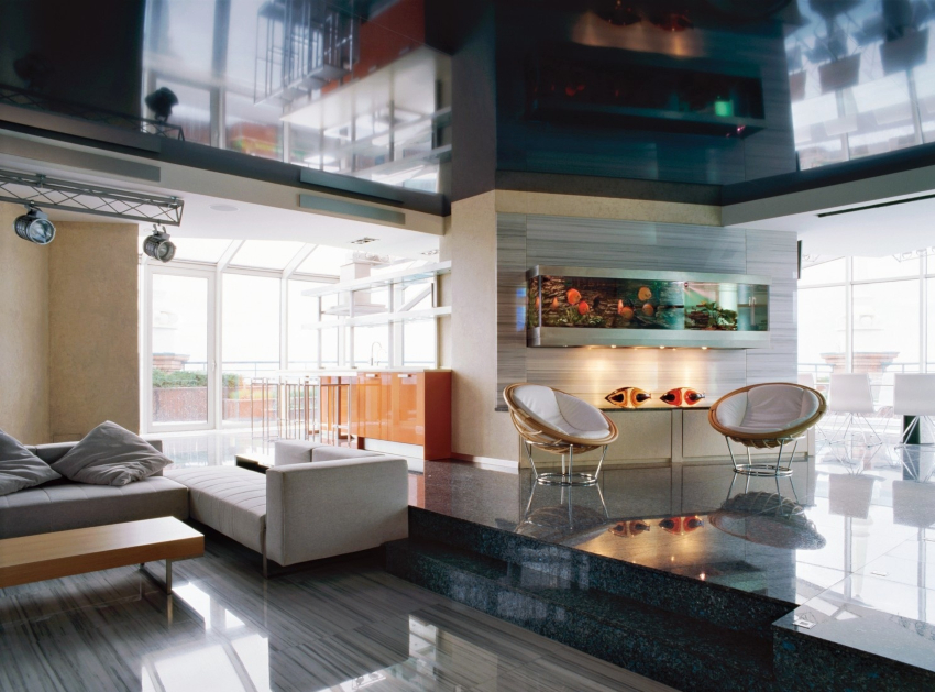 Pentru decorarea tavanului, se folosește o pânză lucioasă cu multe lămpi, care sunt instalate în etapa finală a renovării. Fotografiile cu designul camerei de zi subliniază că crearea unei structuri suspendate din gips-carton cu o configurație neobișnuită ar fi, de asemenea, o opțiune potrivită. Pictura tradițională de suprafață este acceptabilă.