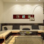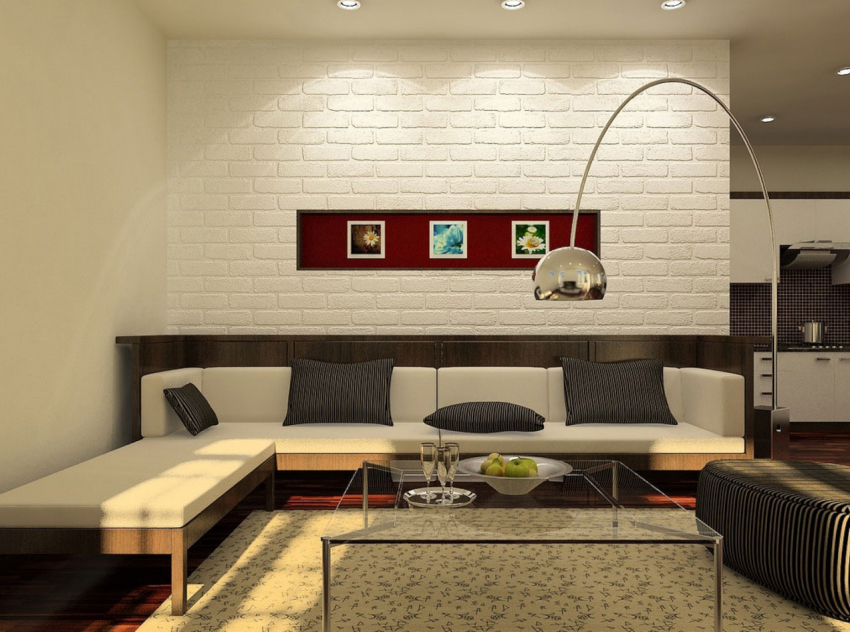 Pereții sălii în stil minimalist sunt de obicei finisați cu tencuială decorativă. Pereții de cărămidă sau baza din beton vopsit se vor încadra în conceptul general. O astfel de neglijență deliberată în decor va conferi camerei un farmec unic, care poate fi văzut în fotografiile reale ale designului camerei de zi din Hrușciov.