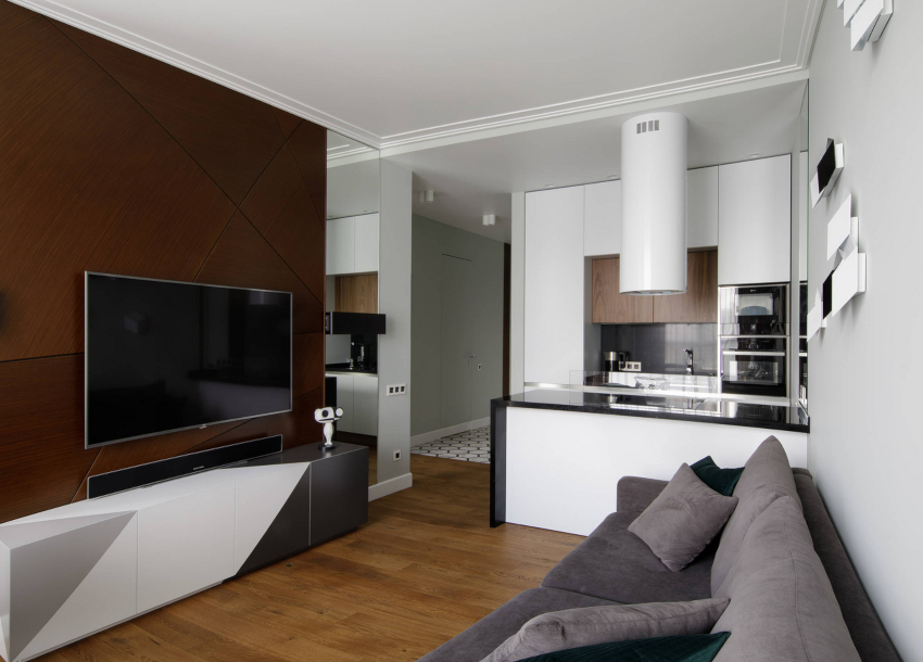Design frumos al unei camere de zi într-un apartament în stil modern