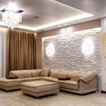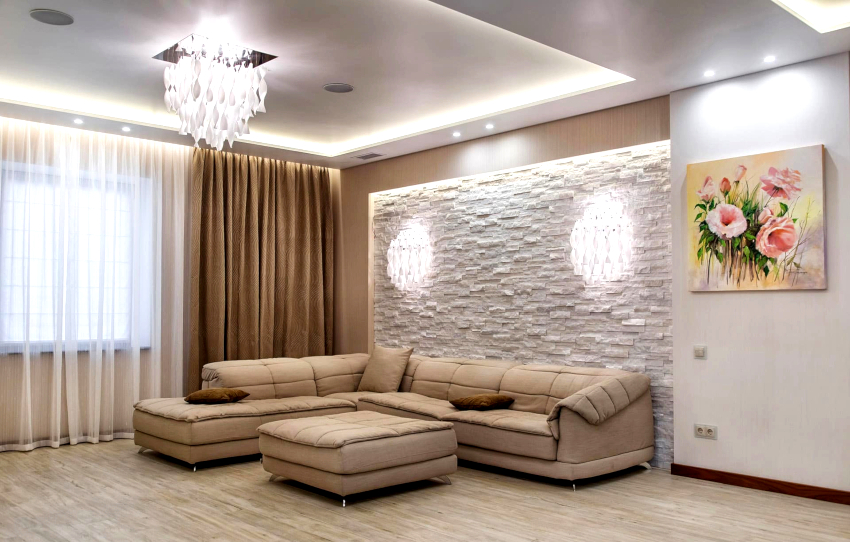 Pentru decorarea pereților, imaginile de fundal sunt utilizate în principal, iar designerii recomandă combinarea produselor cu textură, culoare și model diferite. Designul original al unui living mare poate fi obținut folosind o acoperire cu țesături, care va umple camera cu căldură și confort. Pictura tradițională a pereților, care ar trebui să aibă o suprafață de relief, arată simplu, dar de bun gust. Unul dintre pereți poate fi decorat cu piatră artificială.