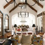 O cameră de zi rustică ar trebui să fie umplută cu lumină naturală, ceea ce se realizează prin utilizarea unor tulle transparente ușoare pe ferestrele mari. Pentru iluminatul artificial, este instalat un candelabru masiv, situat în partea centrală a tavanului. Ar trebui să aibă un cadru metalic și un număr mare de nuanțe de cristal în formă de floare. Zona de relaxare poate fi completată de sfeșnice de masă. Opțiunile posibile de iluminare sunt prezentate în fotografia designului sălii din casă.