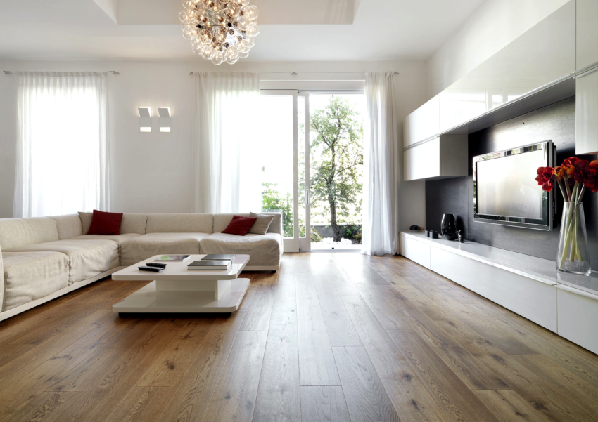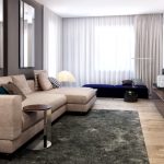 Pentru a termina pardoseala, alege parchet cu hering sau laminat în aceeași paletă de culori ca și mobilierul. Plăcile frumoase din marmură sau ceramică cu o suprafață lucioasă se vor potrivi perfect în interior. Pentru a efectua zonarea spațiului, puteți utiliza podiumul. Pentru o atmosferă caldă și confortabilă, așezați un covor cu o grămadă înaltă și densă lângă canapea.