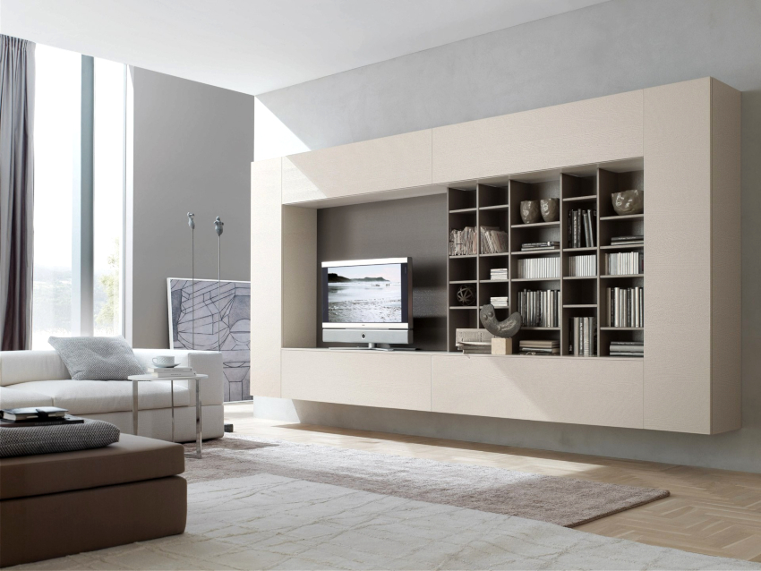 Atunci când alegeți mobilier pentru camera de zi, se preferă sistemele modulare care se disting prin funcționalitate, caracter practic și ușurință în utilizare. Opțiunile voluminoase vor fi inadecvate aici. Mobilierul pentru dulap trebuie să aibă fronturi lucioase și accesorii cromate. Elementele din sticlă sub formă de măsuță de cafea, rafturi sau rafturi se vor potrivi organic în interior, ceea ce va conferi atmosferei o senzație de ușurință și aerisire.