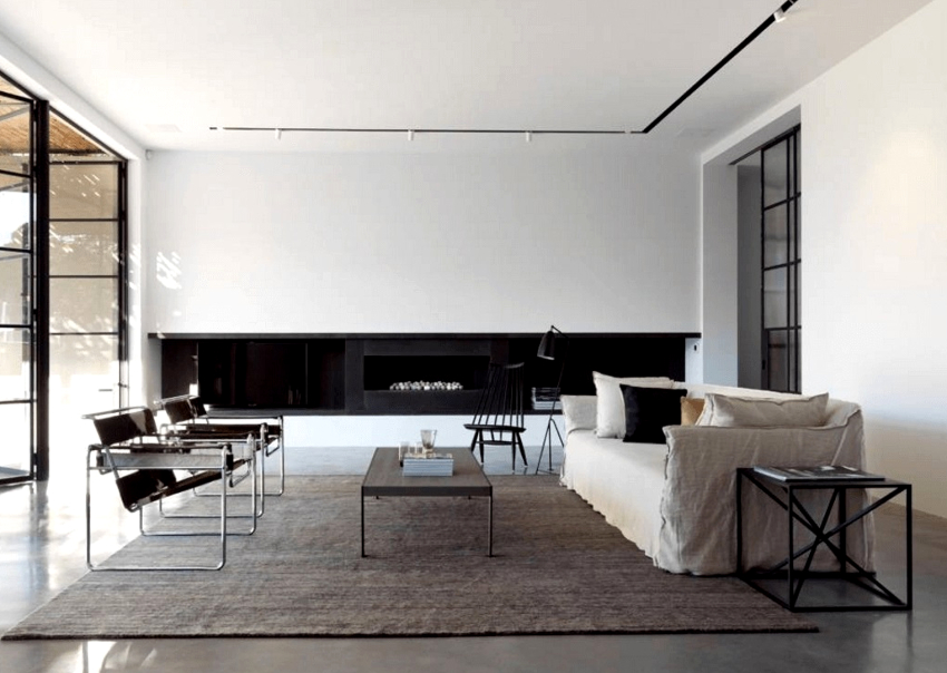 Important! Covorul este neobișnuit pentru minimalism, dar puteți așeza un covor mic în zona de relaxare.