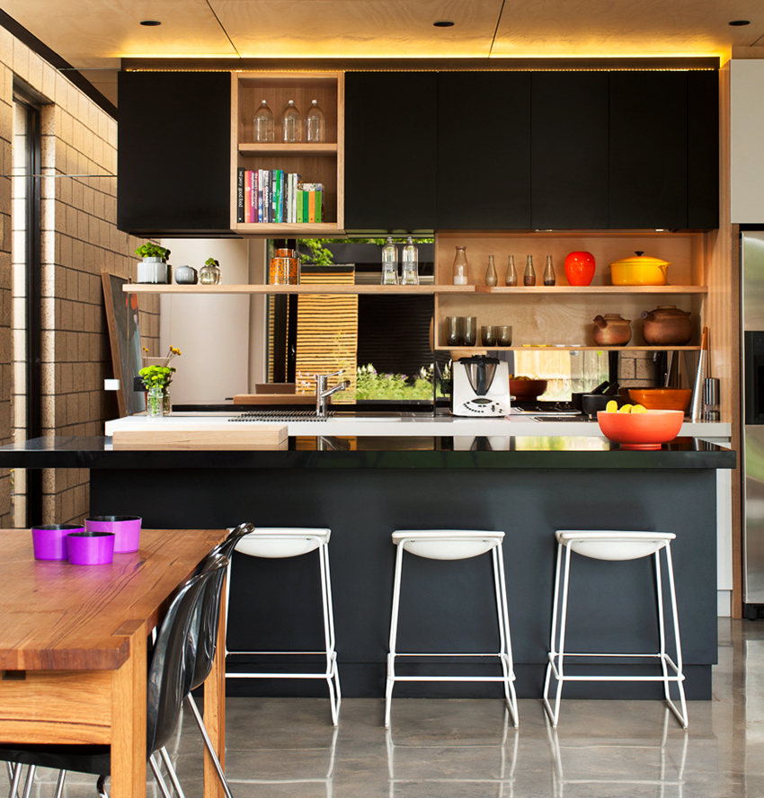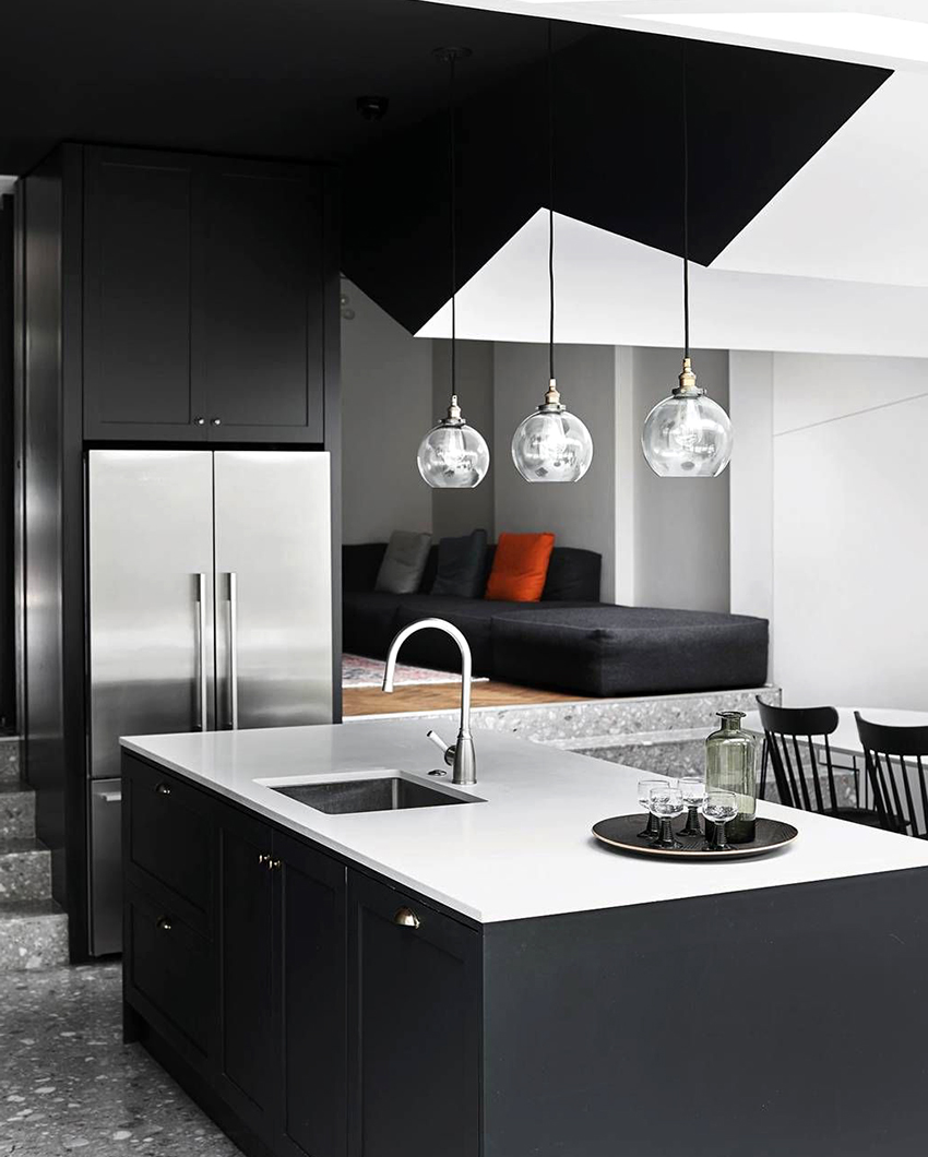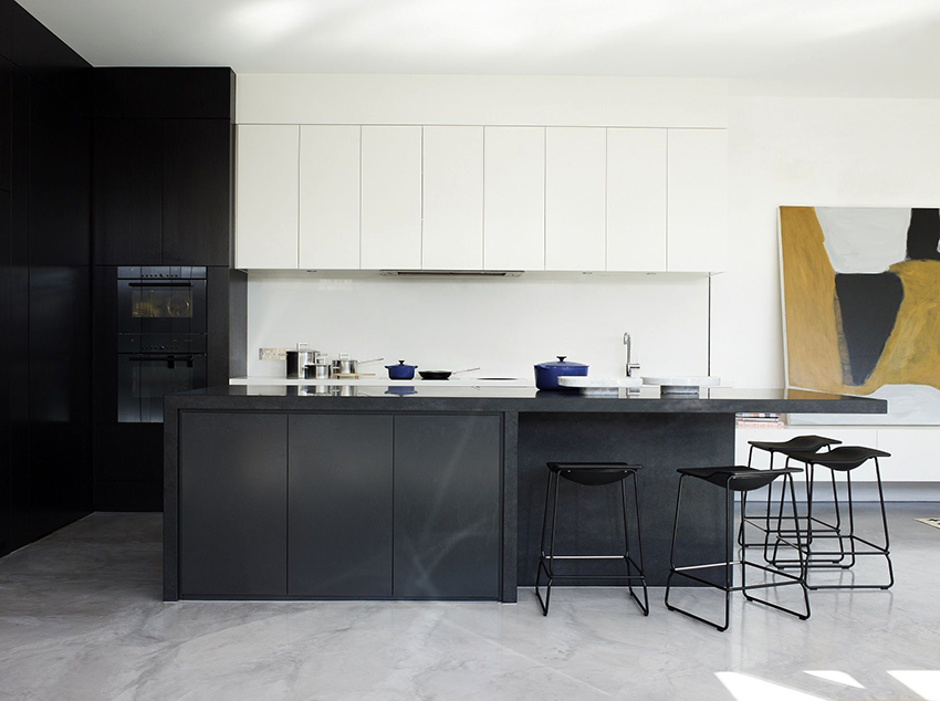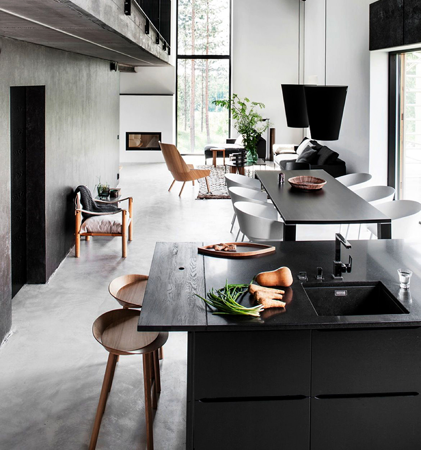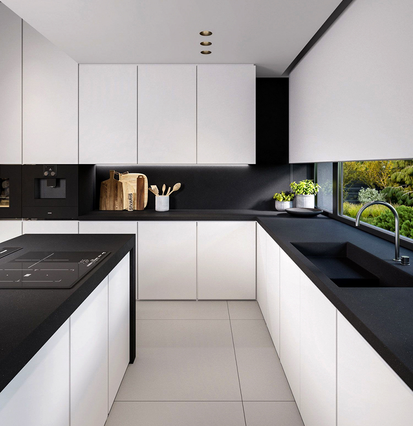 - Predominanța negrului va fi potrivită în culorile fațadelor, în timp ce unele elemente vor rămâne albe: mobilier în zona de luat masa, blaturi și articole de decor.
