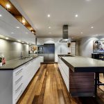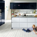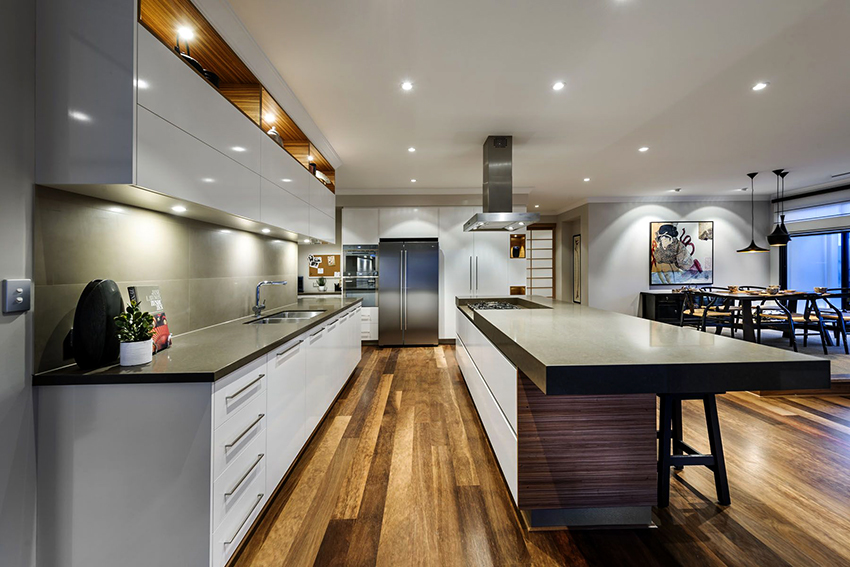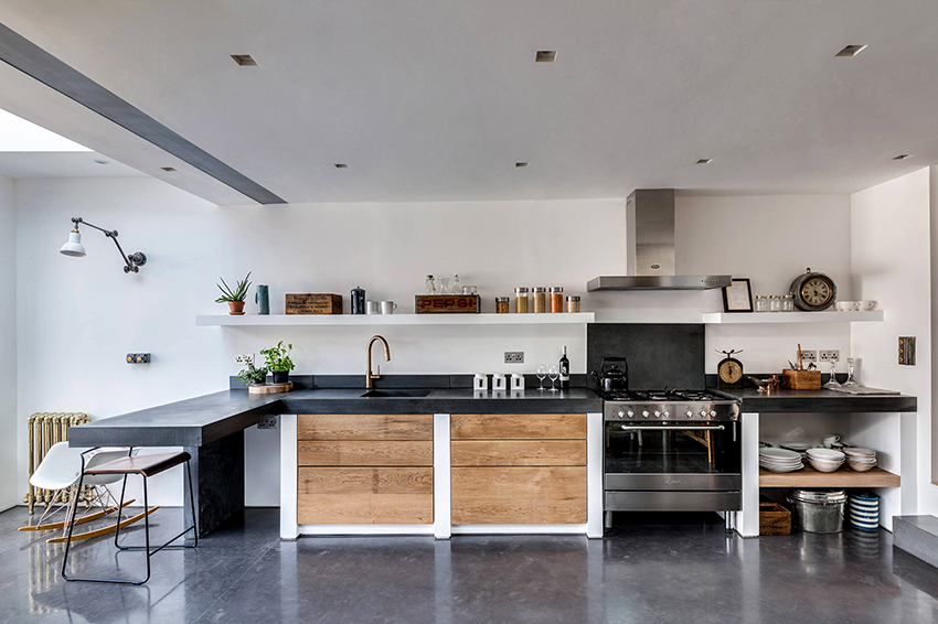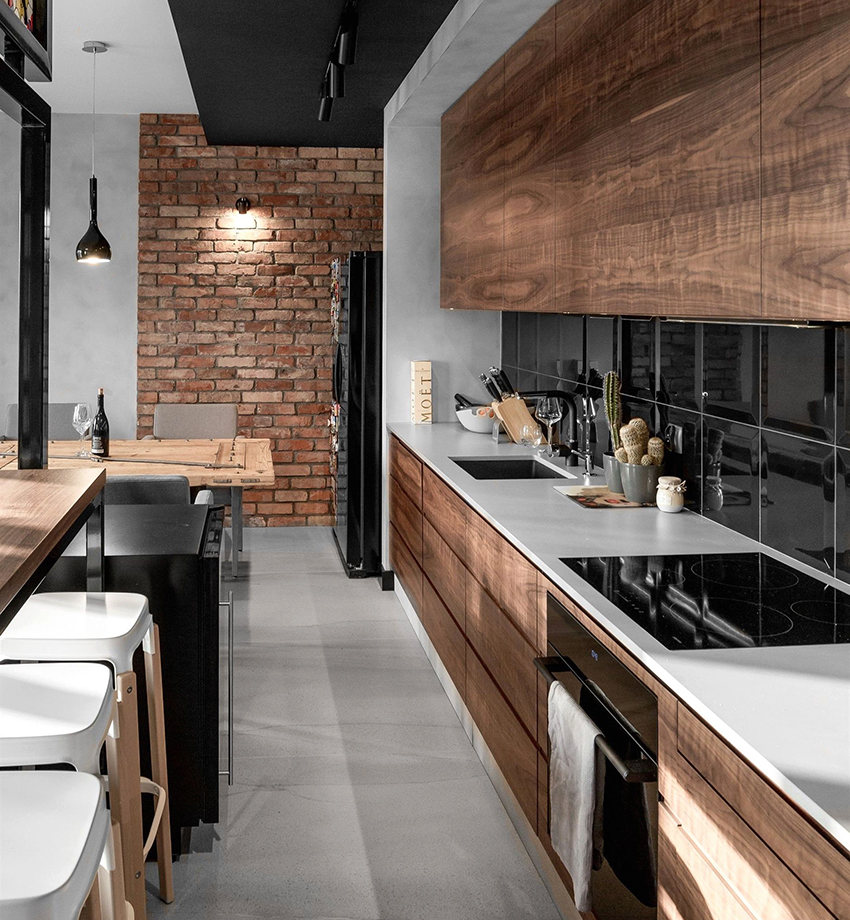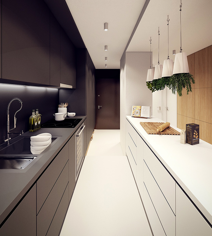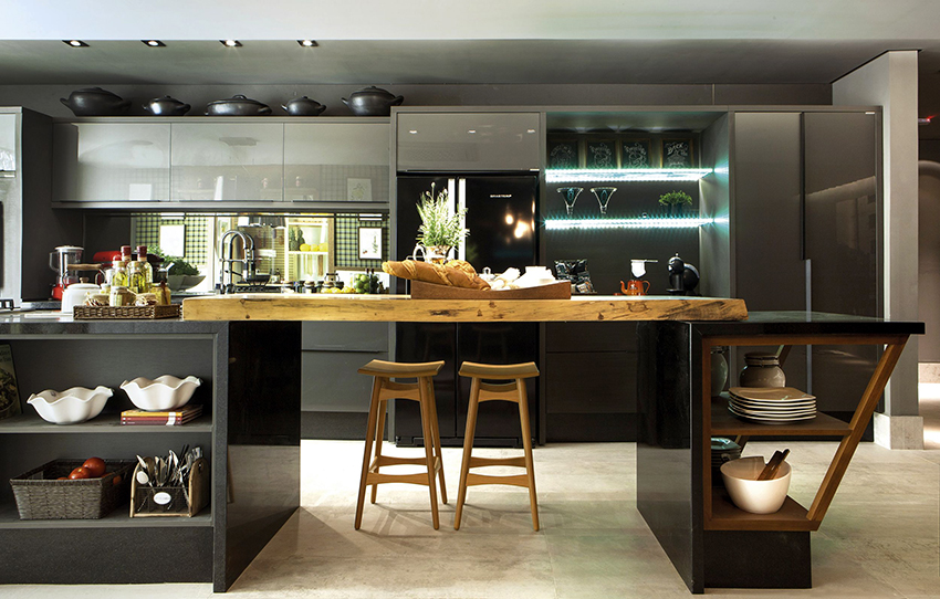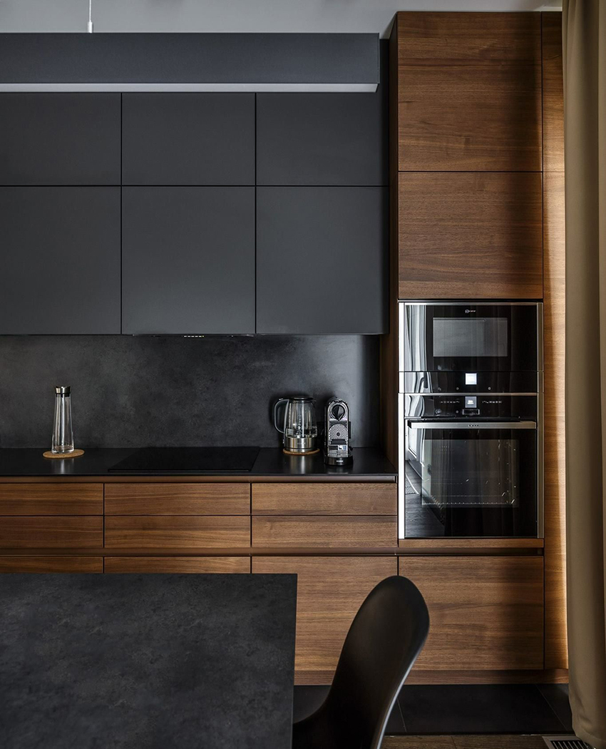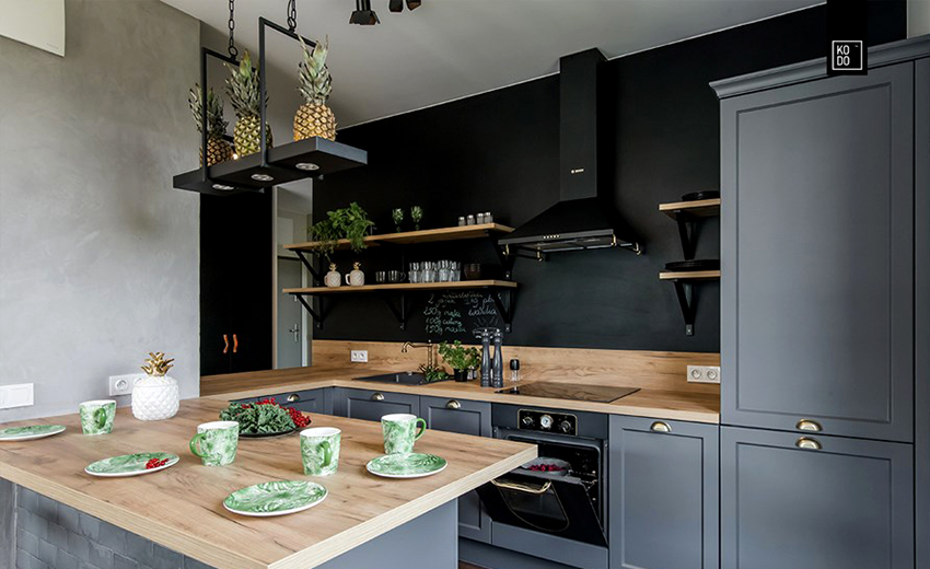 Bucătărie neagră și gri, diluată cu detalii luminoase, potrivită pentru încăperi de diferite dimensiuni