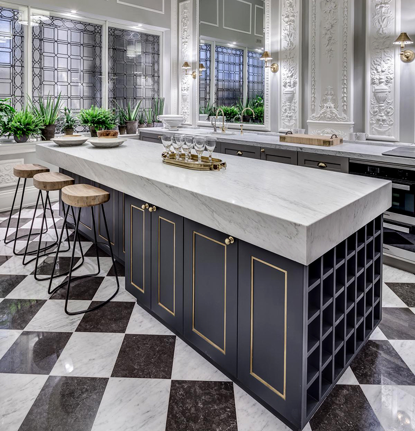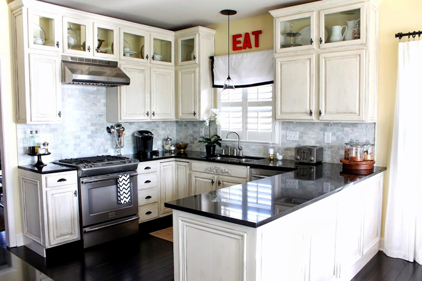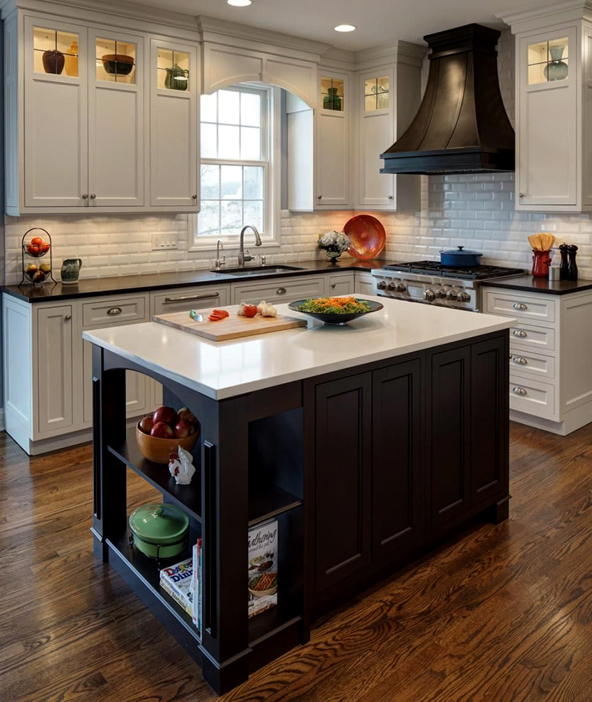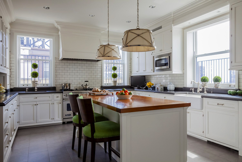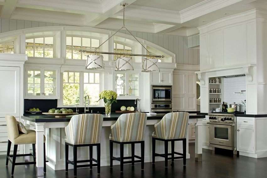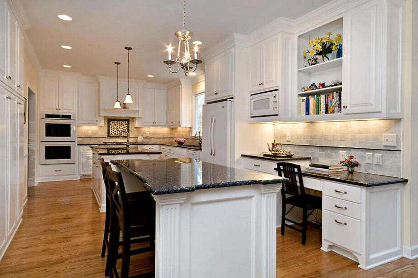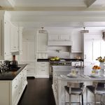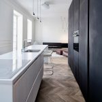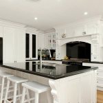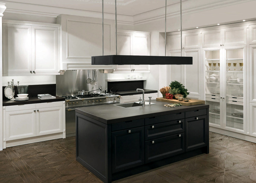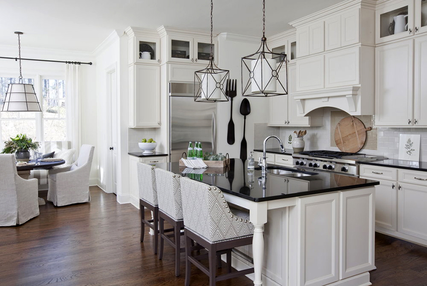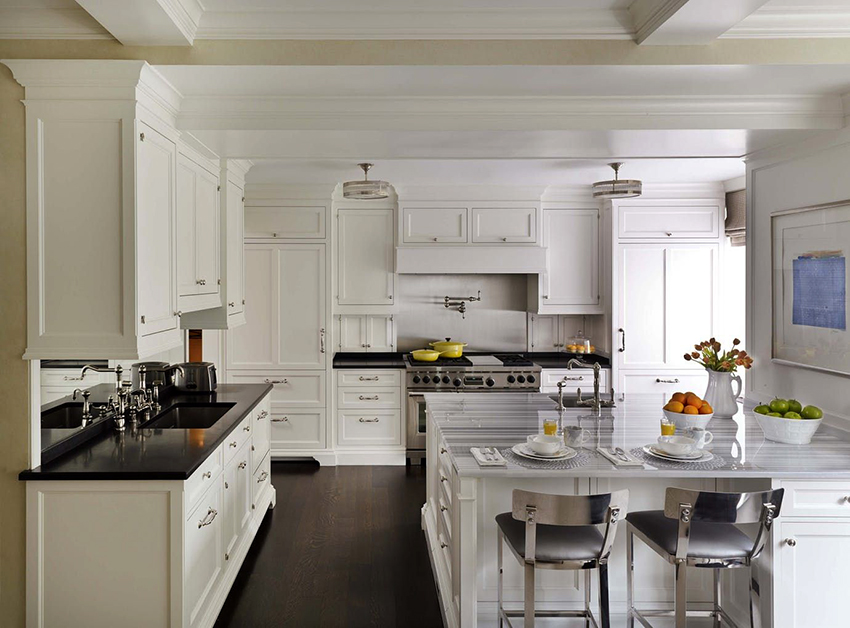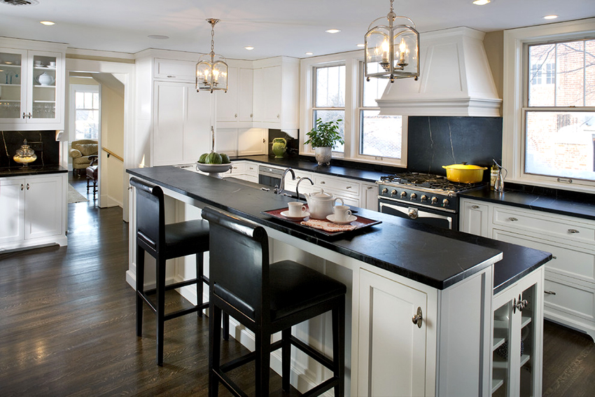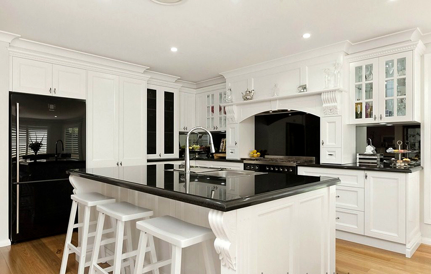 Combinaţie bucătărie albă iar blaturile negre arată cel mai avantajos în stilul unui clasic modern