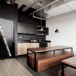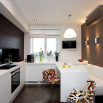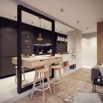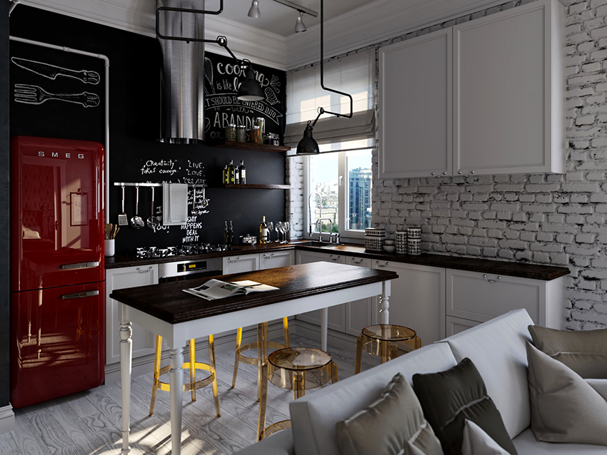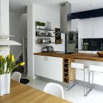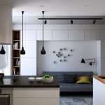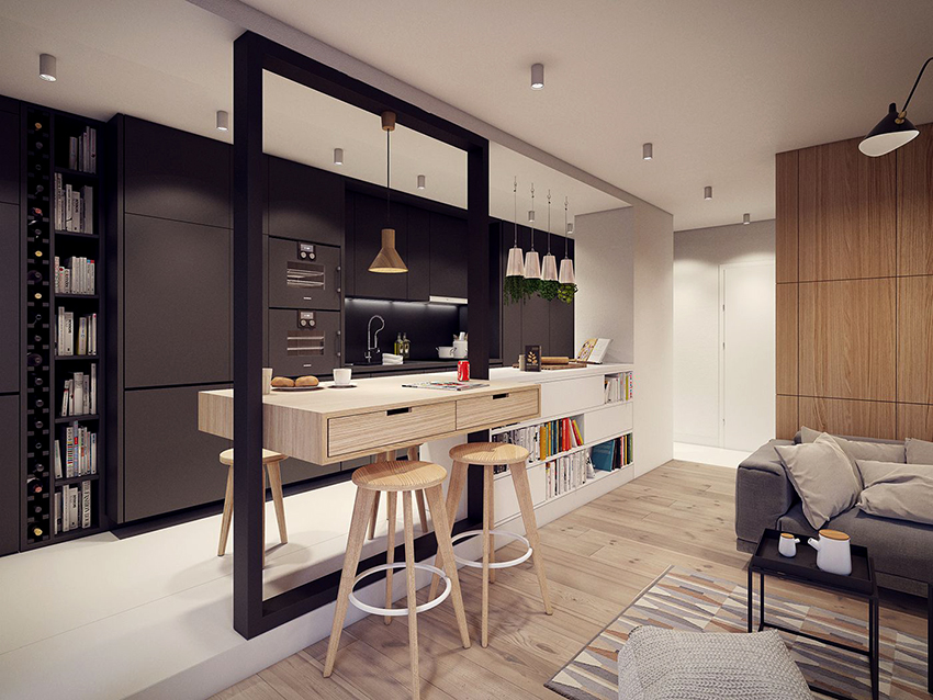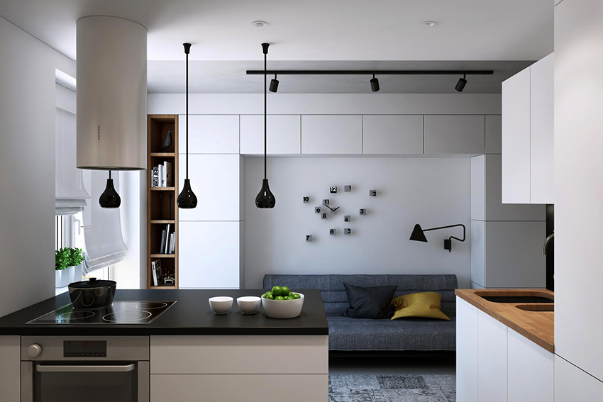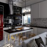 Nu fără motiv, designerii aleg deseori mobilier negru pentru a crea interiorul apartamentelor studio, unde bucătăria este combinată cu sufrageria și camera de zi. Camera de zi în bucătărie alb-negru cu accente atrăgătoare arată deosebit de elegantă.