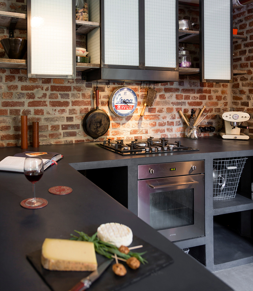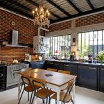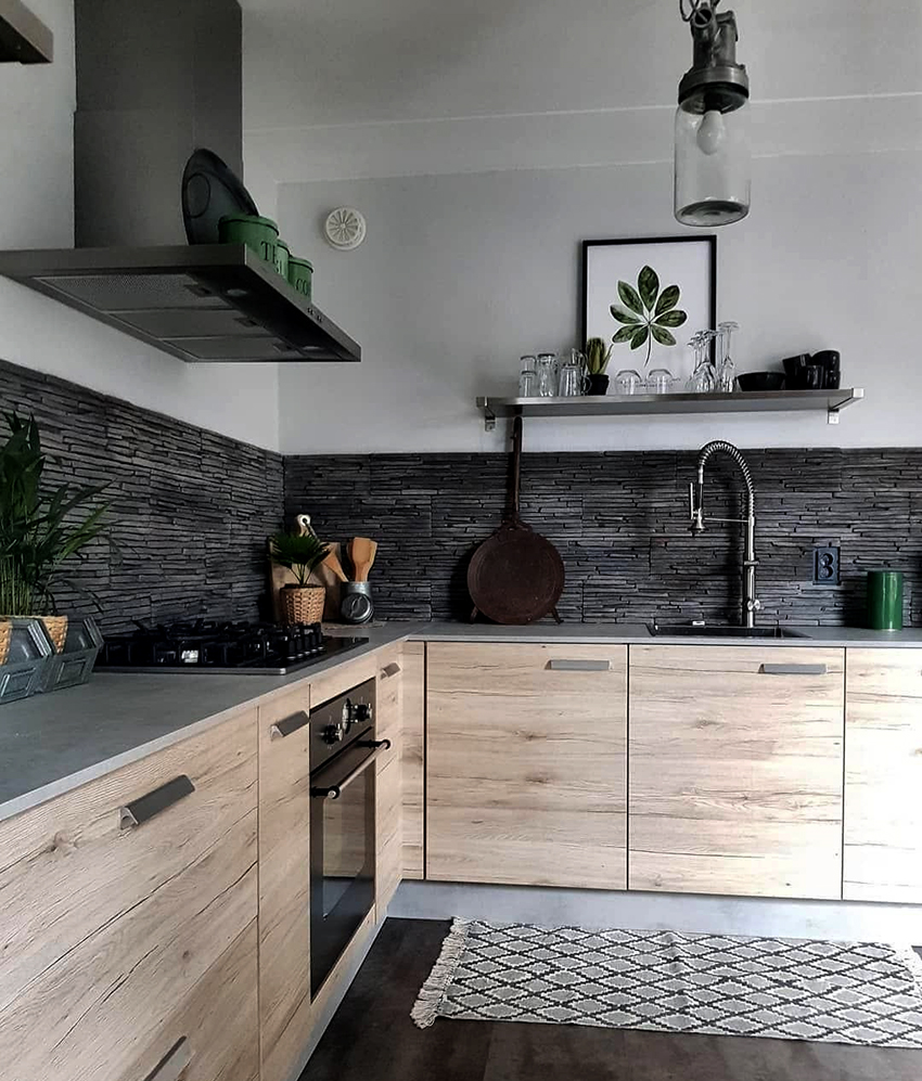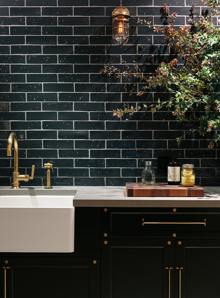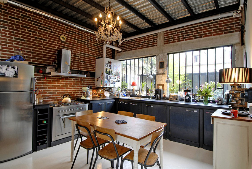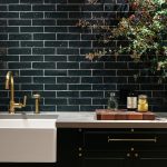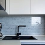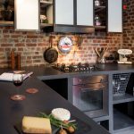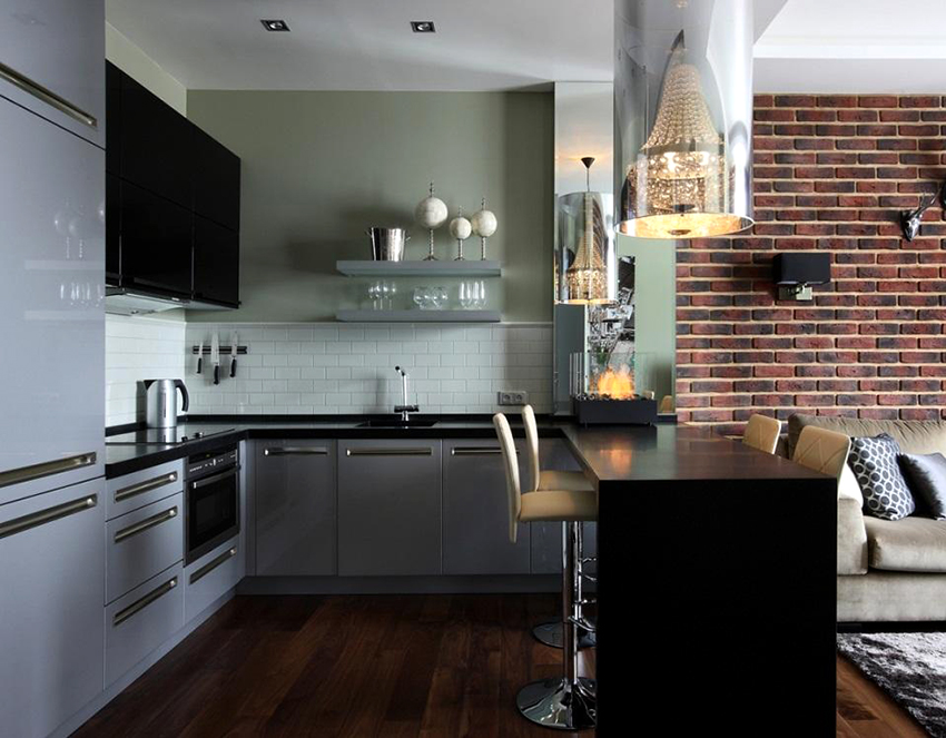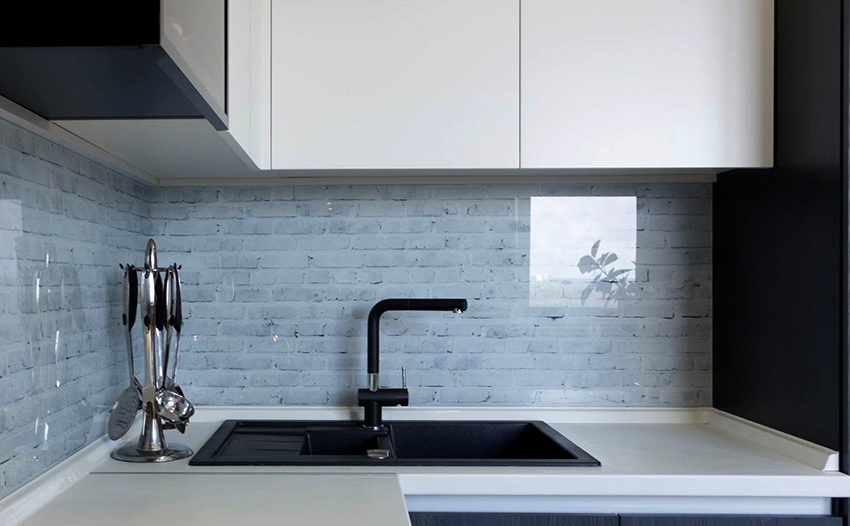 - Un șorț din faianță neagră în bucătărie, din cărămizi cu o impregnare specială, nu se teme de umiditate și schimbări de temperatură, așa că va arăta grozav într-un interior de orice stil și în combinație cu fațade diferite.
