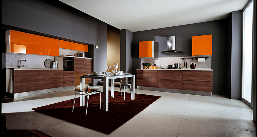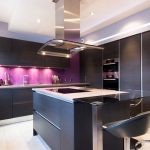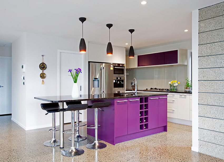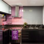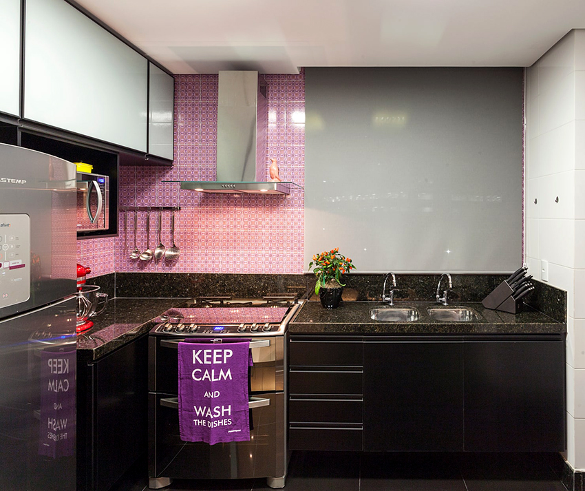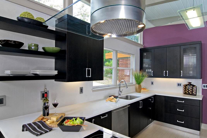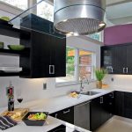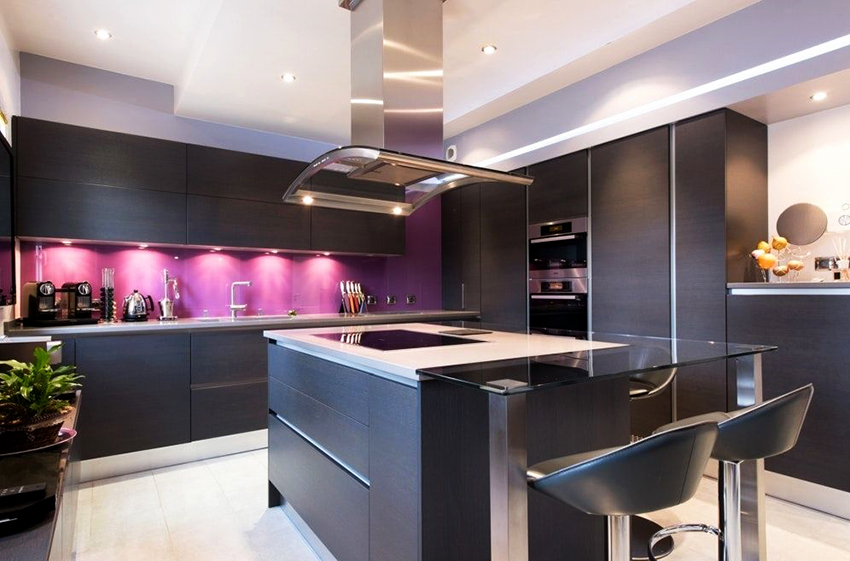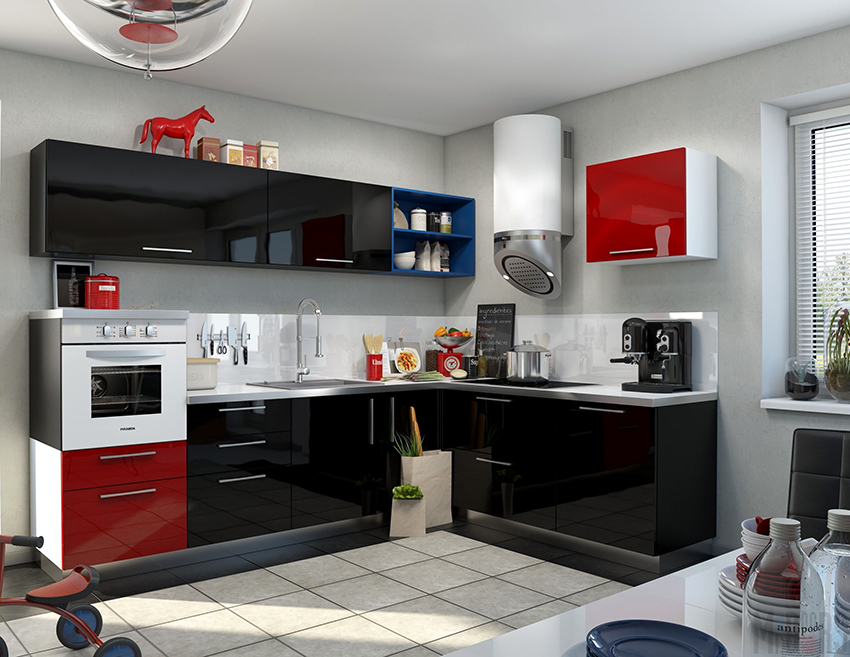 Atunci când bucătăria se bazează pe un set negru, principalul lucru nu este să ne confundăm cu culoarea de fundal. Cea mai bună opțiune ar fi utilizarea unor nuanțe luminoase contrastante care să sublinieze simplitatea, rafinamentul și adâncimea mobilierului negru, căruia i se atribuie rolul principal. Un plus luminos pentru finisajul ușor poate fi elementele de accent de roșu sau violet.