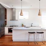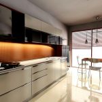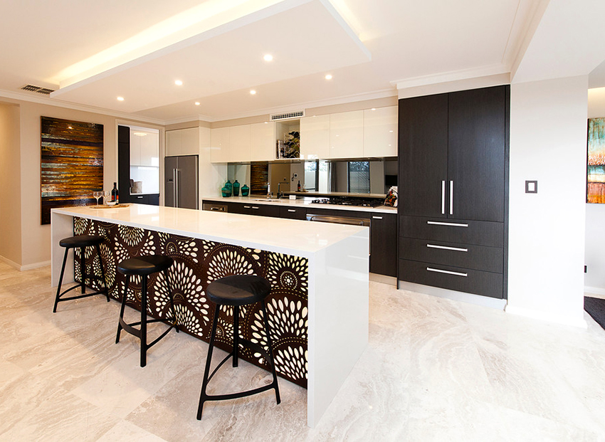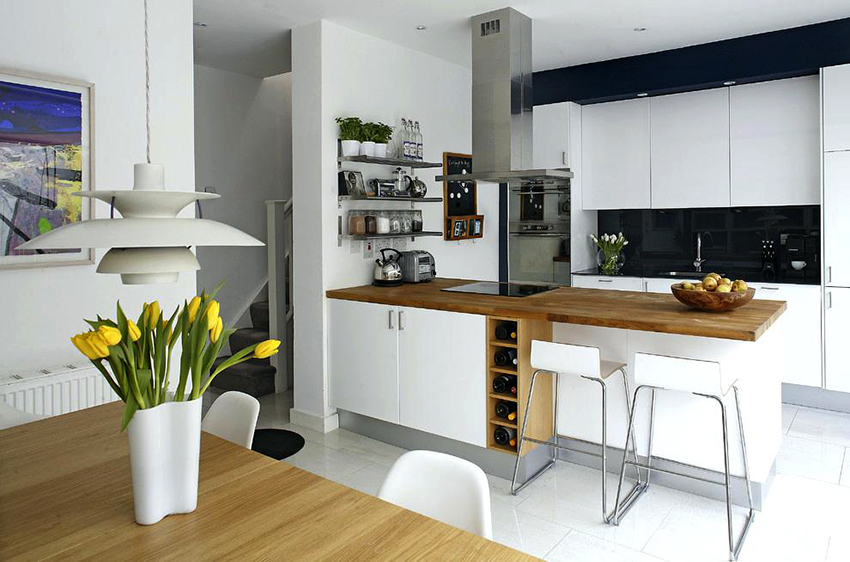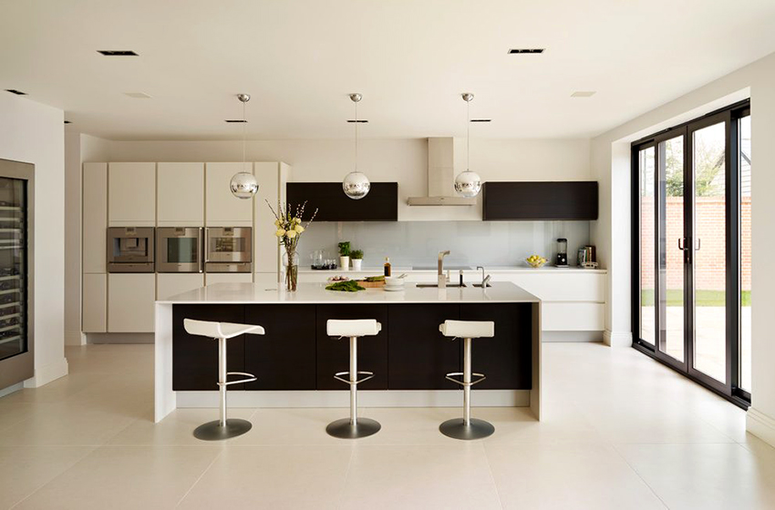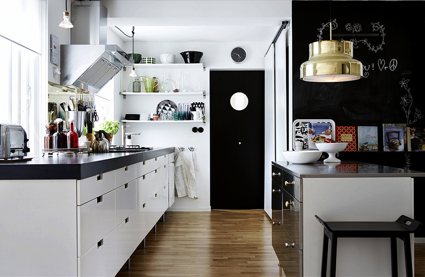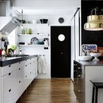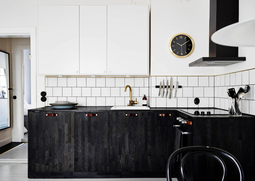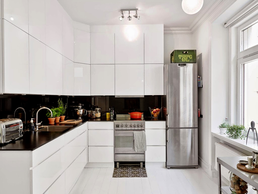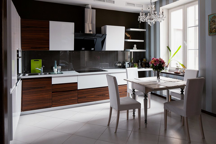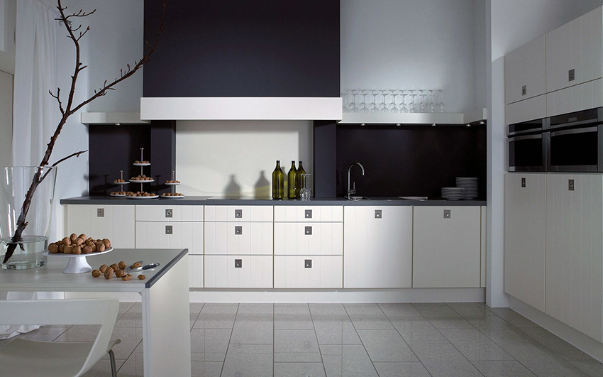 - Albul principal este prezent în culorile fațadelor superioare, pereților și tavanelor, iar negrul acționează ca culoarea fațadelor inferioare, a blaturilor și a pardoselilor. Plăcile albe și negre din bucătărie vor arăta deosebit de armonioase în decorarea șorțului și a podelei.
