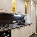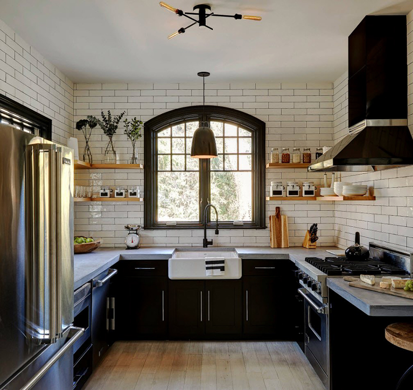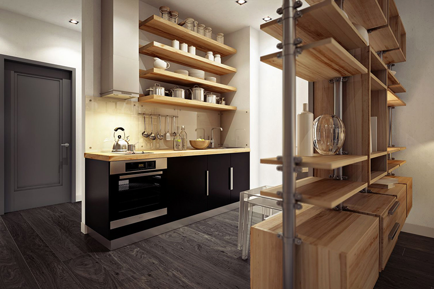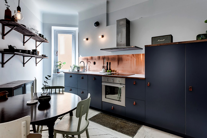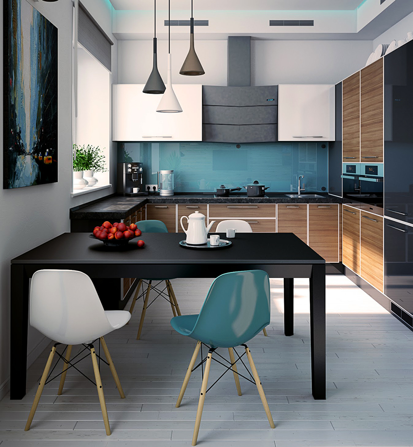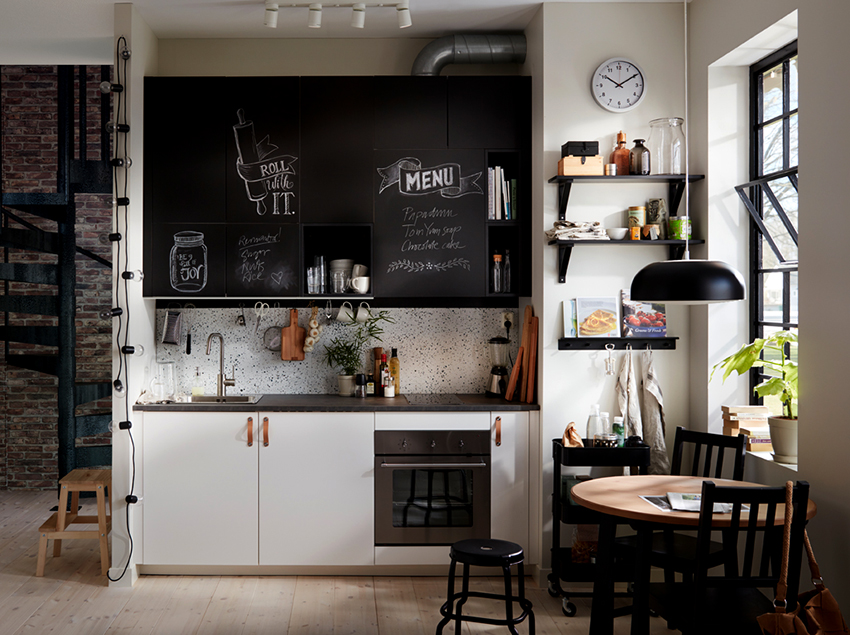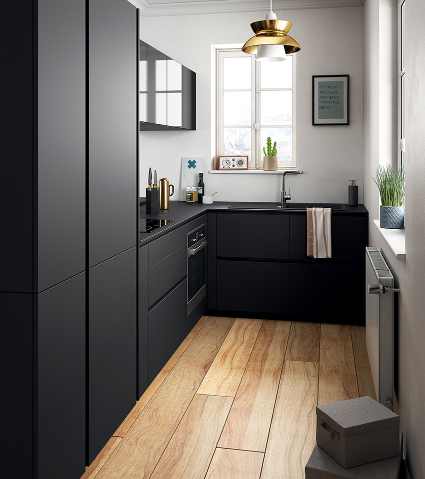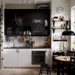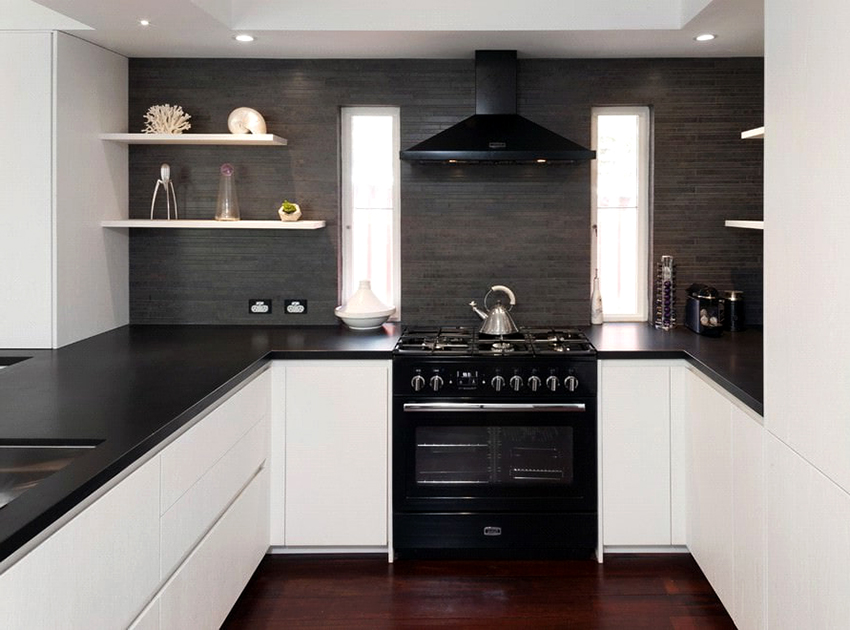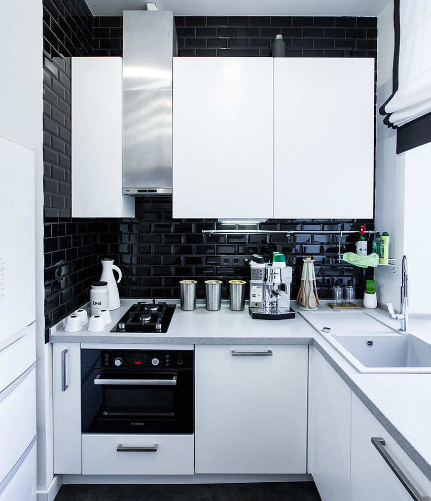 - Tonurile întunecate reduc vizual spațiul, astfel încât într-o bucătărie mică este recomandabil să alegeți negru doar ca accent.