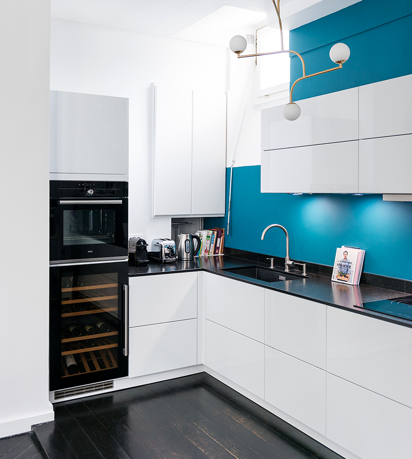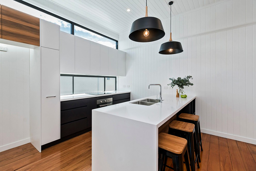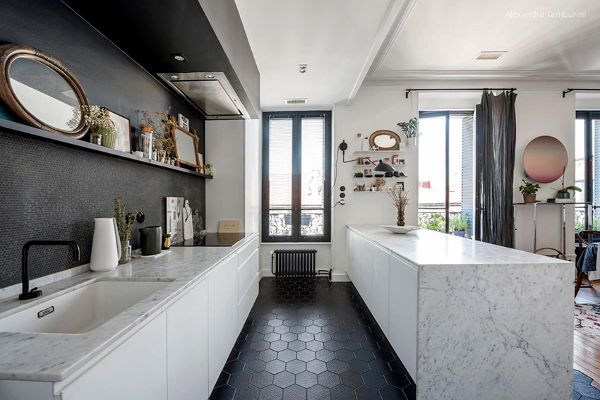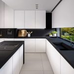 Bucătărie albă cu blat negru: combinația perfectă de contrarii
