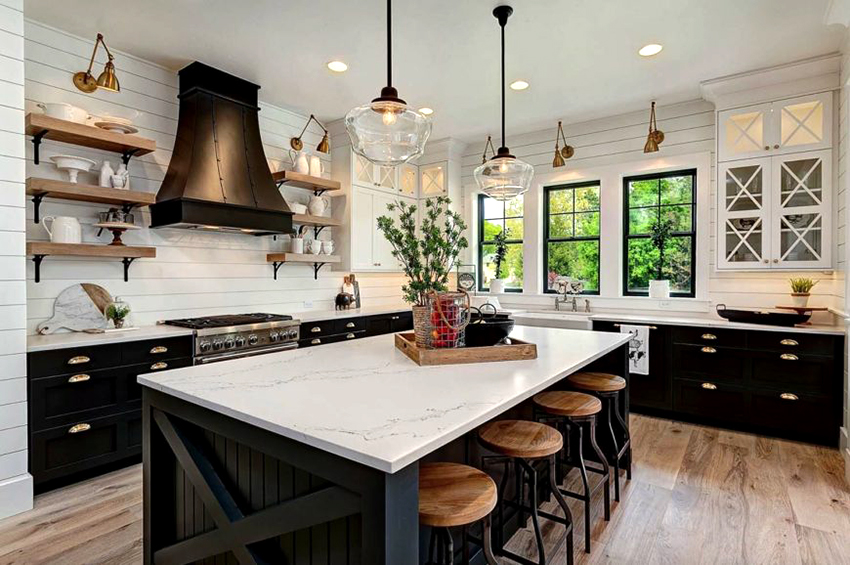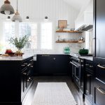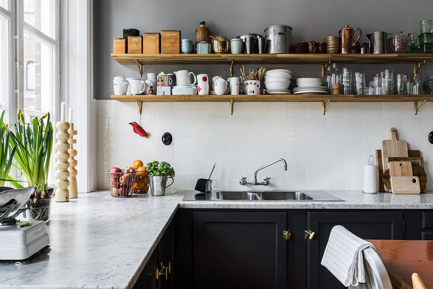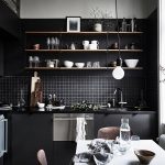 Sfat util! Pereții sau pardoseala în culori deschise, blaturile din piatră sau decorarea cu mâncăruri albe vor ajuta la reîmprospătarea bucătăriei cu un set negru.