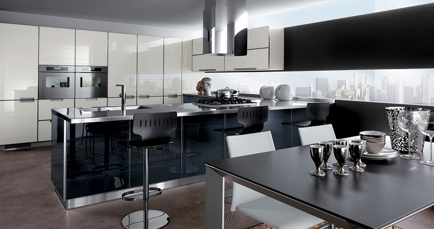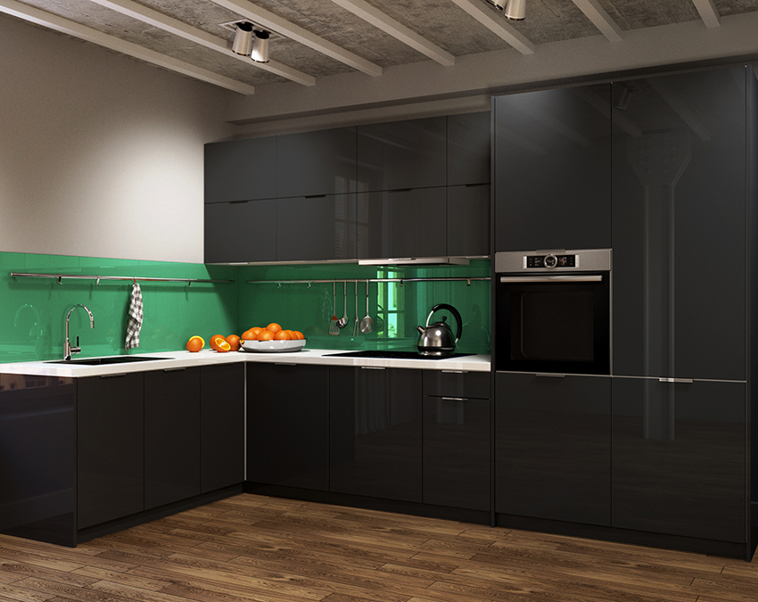 Seturile de bucătărie în negru se caracterizează prin forme laconice, linii clare și suprafețe strălucitoare. Cel mai adesea sunt produse în combinație cu fitinguri cromate, sticlă, blaturi și chiuvete din oțel inoxidabil sau piatră artificială. Astfel de bucătării vor fi adecvate în diferite interioare, dar cel mai bine se încadrează în stilul minimalismului, avangardei, high-tech-ului sau art deco datorită tehnicității și industrializării lor.