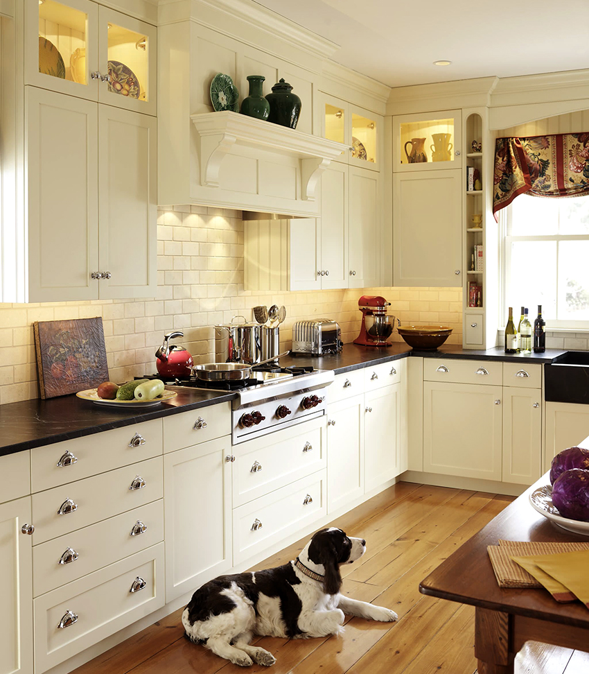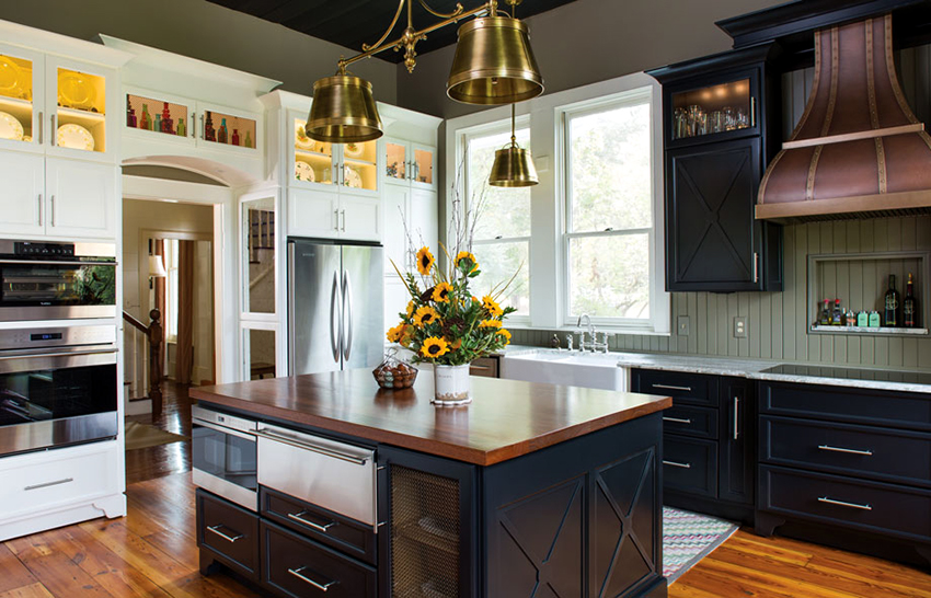 Elementele decorative decorative și materialele naturale, în special lemnul, lutul, piatra și plantele de apartament, vor ajuta la evitarea aspectului industrial al interiorului. Aceste nuanțe vă vor permite să creați o bucătărie neagră în spiritul clasicismului. Un astfel de interior va arăta decent, mai ales dacă există dulapuri de perete cu uși de sticlă, care vor facilita vizual designul. În același timp, o cască neagră în stil clasic poate arăta oarecum voluminoasă, deci trebuie să aveți grijă de un fundal deschis și de o iluminare suficientă.
