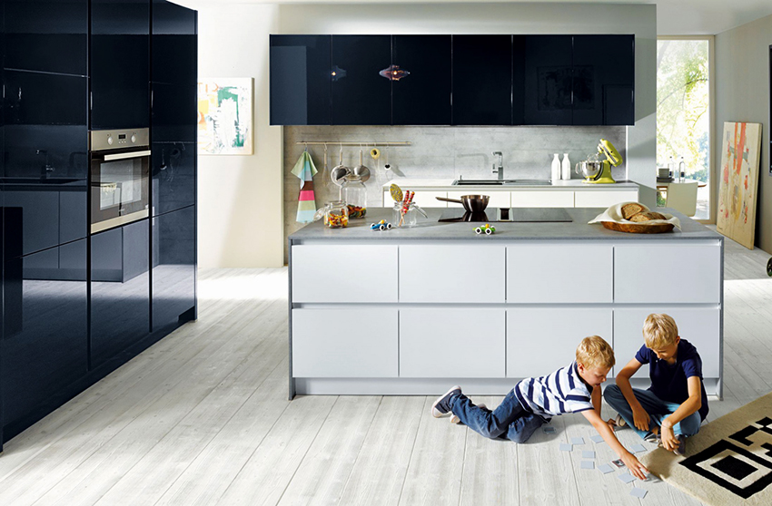 În același timp, imprimeurile și dungile vor fi mult mai vizibile pe blatul de lucru al unei bucătării negre lucioase. Pentru a nu vă înșela cu alegerea stratului de acoperire, puteți lua probe pentru o probă și le puteți verifica în felul următor: ștergeți cu un burete umed, lăsați să se usuce, apoi presărați cu apă fără ștergere și bateți la suprafață cu degetele. După astfel de proceduri, va fi ușor de evaluat în ce măsură rămân urme pe blat și dacă pot fi îndepărtate cu ușurință.