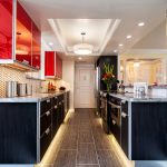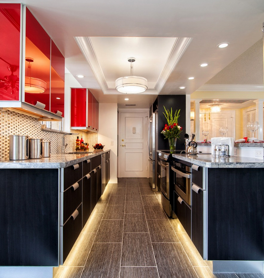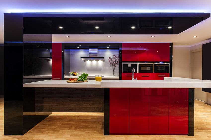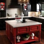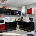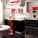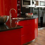 Sfat util! La negru-bucătărie roșie a sunat într-un mod nou, puteți plasa o cască neagră pe fundalul pereților vopsiți în roșu. Șic și glamour suplimentare vor fi oferite de un candelabru cu pandantive din cristal și mobilier, accesorii și electrocasnice încrustate din cristal.