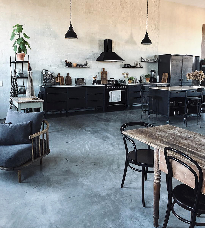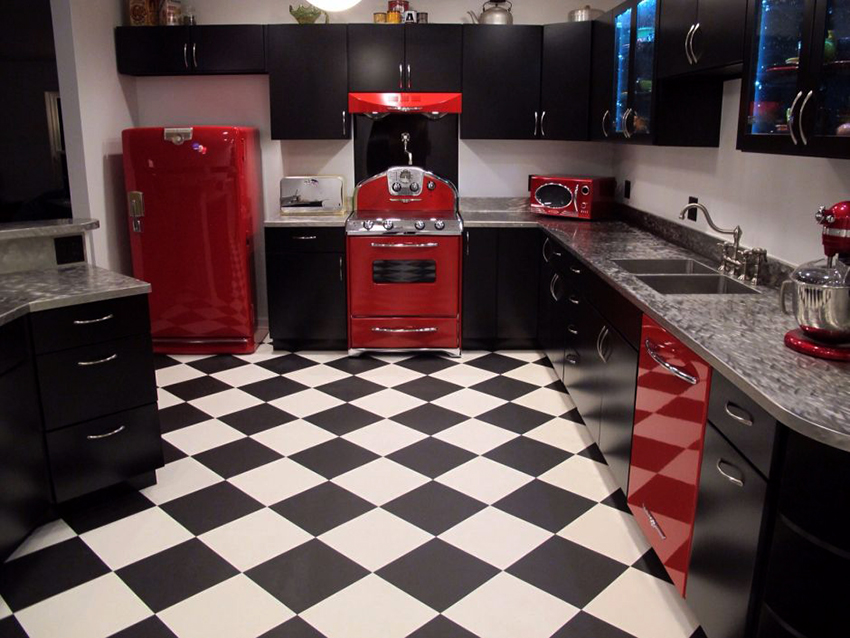 Podeaua neagră va adăuga respectabilitate și costuri ridicate interiorului, dar va reduce vizual spațiul. Acoperirea în culori închise este inacceptabilă în bucătăriile mici, deoarece va fura spațiul deja lipsit. În același timp, pardoseala neagră va crea o combinație excelentă cu pereții vopsiți în diferite culori.