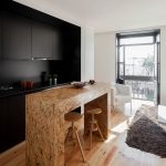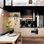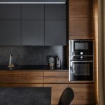 Bucătăria neagră și bej ajută la atenuarea întunericului, creând o atmosferă confortabilă a unei cafenele sofisticate. Adăugările din țesături și materiale naturale se vor potrivi perfect într-un astfel de interior. Rezultatul este un mediu modern și natural.