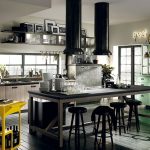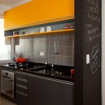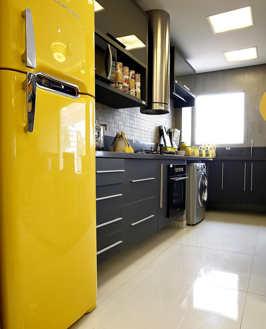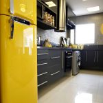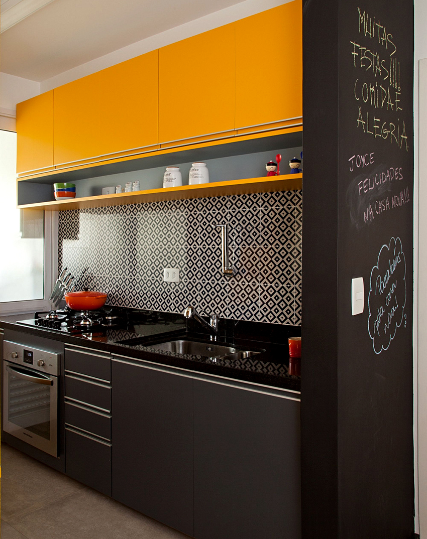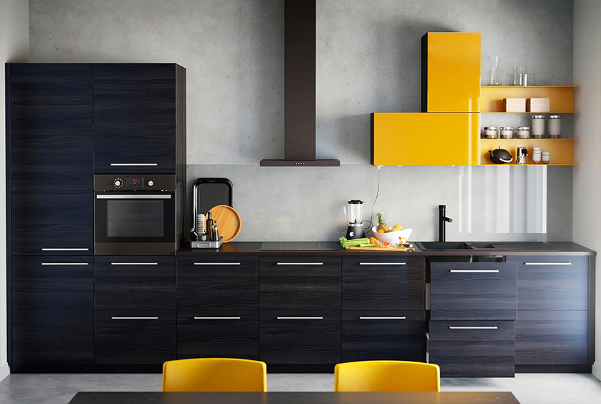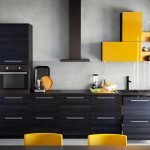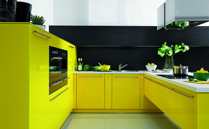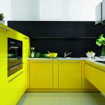 Negru-bucătărie galbenă Este o combinație de două tonuri bogate și intense. Galbenitatea delicată și strălucitoare conferă delicatețe și creează un contrast emoțional cu negrii adânci. Astfel, un interior de bucătărie expresiv și decisiv, care combină contrariile, aduce o notă veselă și creează o dispoziție însorită.