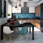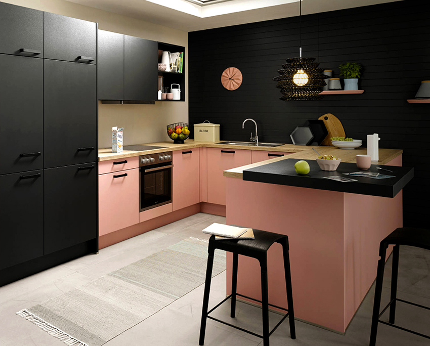 Astfel, datorită versatilității sale, negrul se potrivește bine cu diferite culori, dar este important să mențineți echilibrul, simțul proporțional, să țineți cont de mărimea camerei și de prezența luminii de zi. Aveți grijă să combinați negru cu tonuri întunecate în bucătăriile mici, cu iluminare slabă.