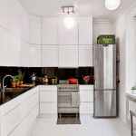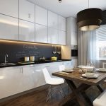 Dacă combinați o bucătărie albă cu un blat negru și un șorț, atunci va apărea un efect pe mai multe niveluri în cameră. Aceste detalii interioare vor accentua simetria și echilibrul, conferind mobilierului un aspect șic. În același timp, un astfel de blat va fi în centrul atenției, deci trebuie păstrat perfect curat. Acest lucru este valabil mai ales pentru bucătăriile lucioase. Fotografiile demonstrează clar atât avantajele, cât și dezavantajele acestui design.