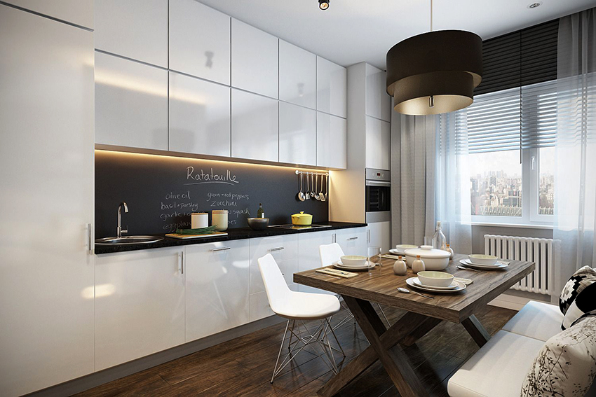 Predominanța albului va ajuta la extinderea spațiului din bucătărie, ceea ce este deosebit de important pentru bucătăriile mici. Abundența de negru va oferi camerei mister, seriozitate și severitate. Dominația sa este acceptabilă în bucătăriile spațioase. Alegerea optimă a designului pentru bucătăriile albe și negre este o distribuție proporțională a două tonuri contrastante, care poate fi exprimată după cum urmează: