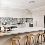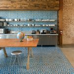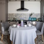 - Formele geometrice regulate pe pereții bucătăriei, cum ar fi pătratele, dungile care se intersectează, creează efectul unui spațiu continuu.